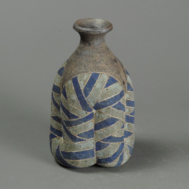 象嵌、彩色、焼きしめの徳利です。細い白い線が象嵌で色の部分は顔料が彩色してあります。 ロクロを引いた後、変形させて成形しています。 花入としても使えます。 W7.2 D7.2 H12.2cm 295g It is an inlaid, colored sake bottle. The thin white lines are inlaid and the colored parts are pigmented. You can also use it as a flower vase. Wheel throwing built Stoneware Reduction firing and reduction cooling