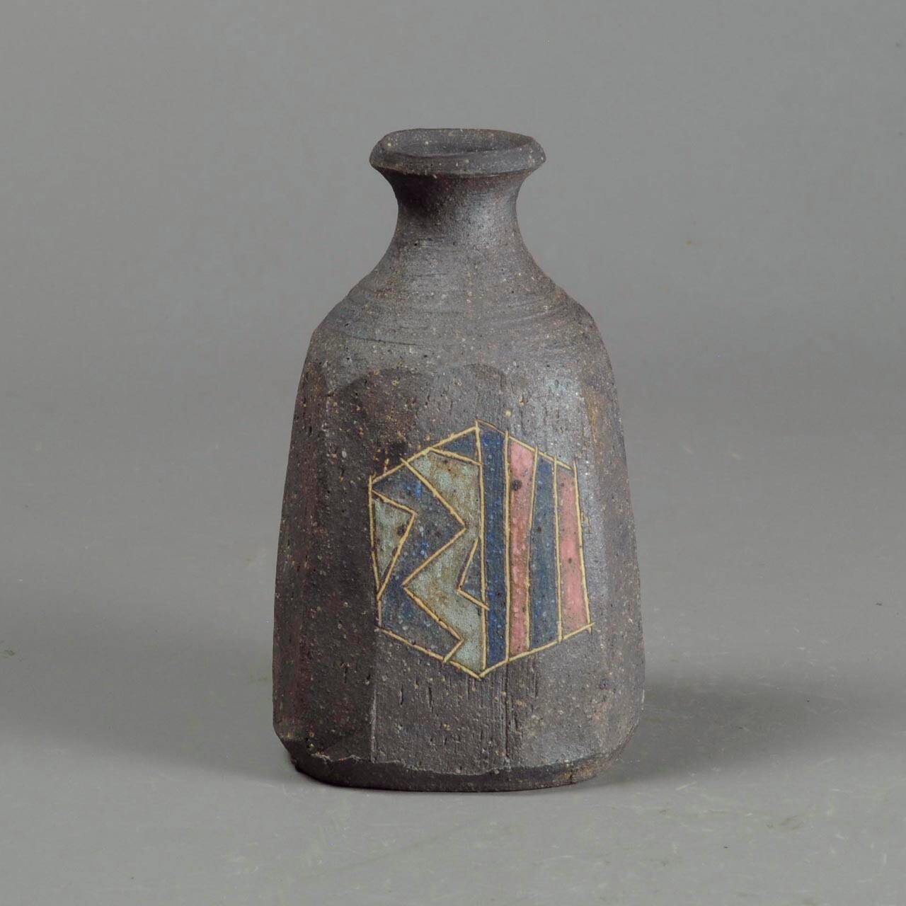 象嵌、彩色、焼きしめの徳利です。細い白い線が象嵌で色の部分は顔料が彩色してあります。
