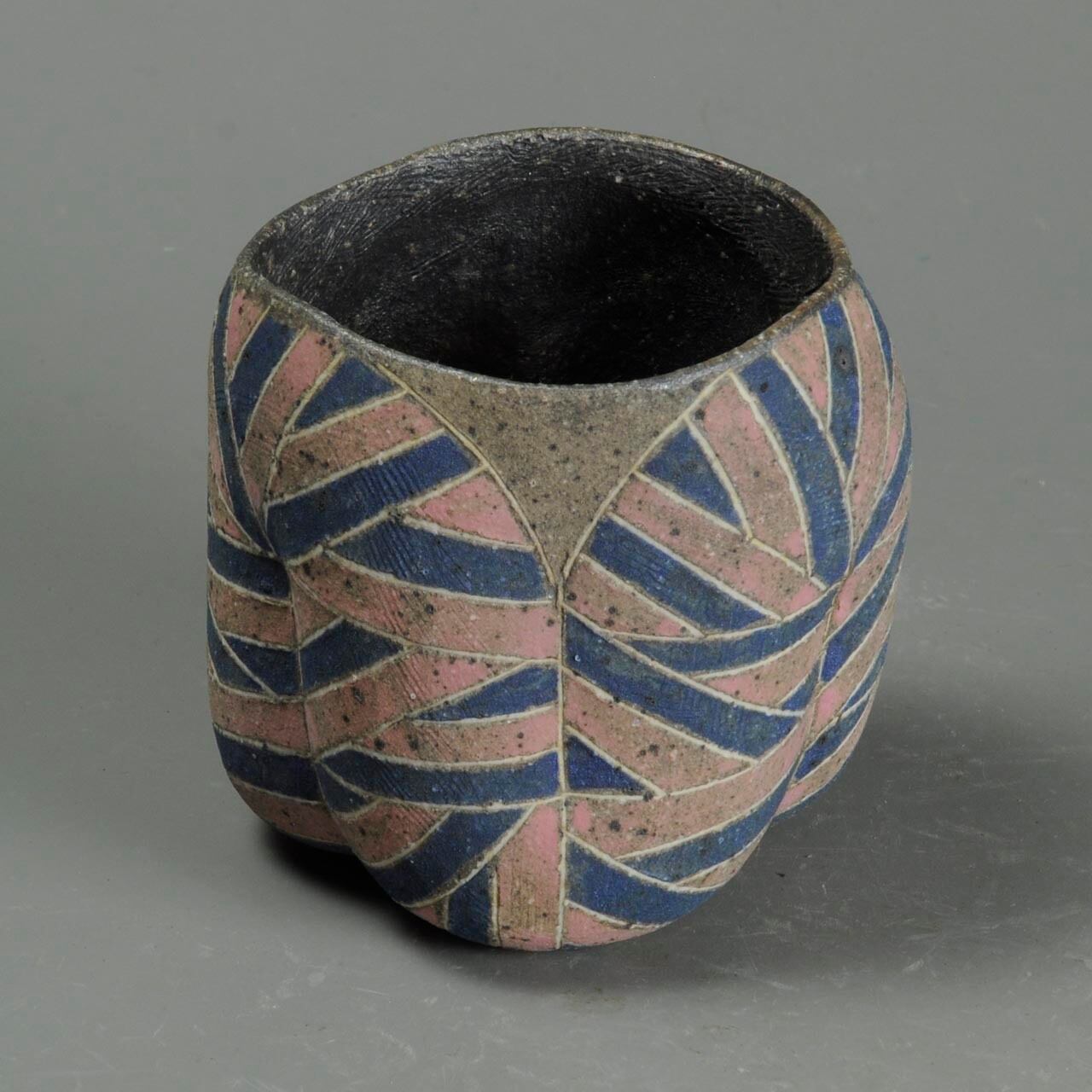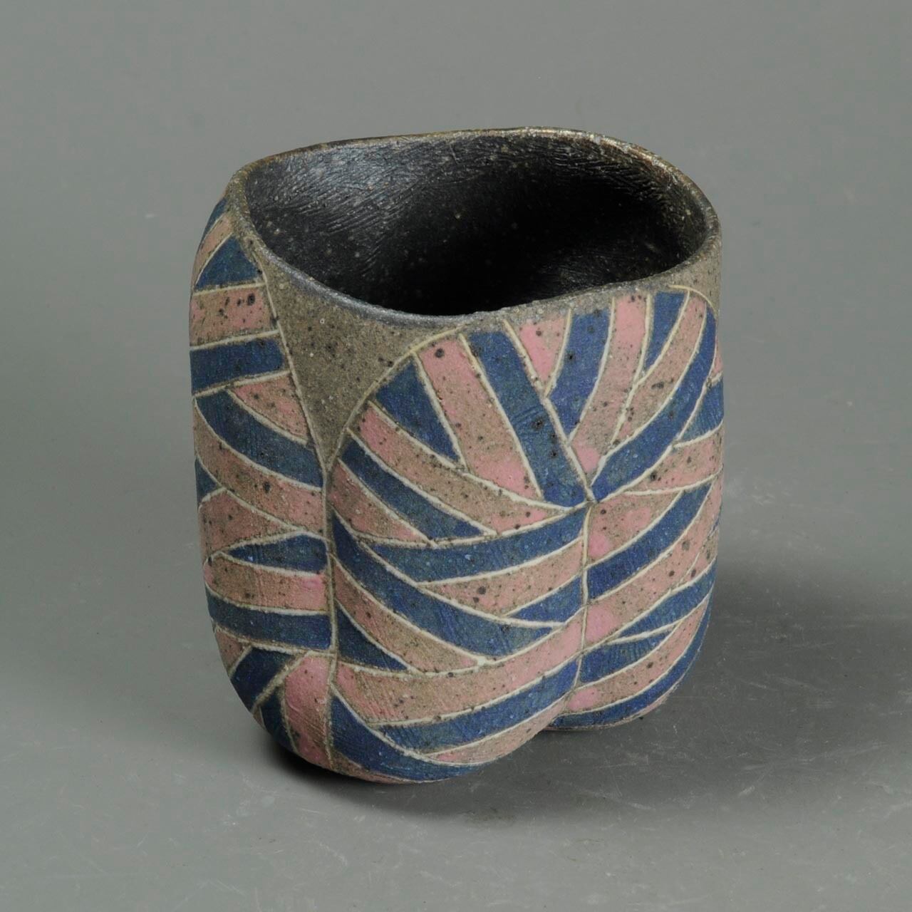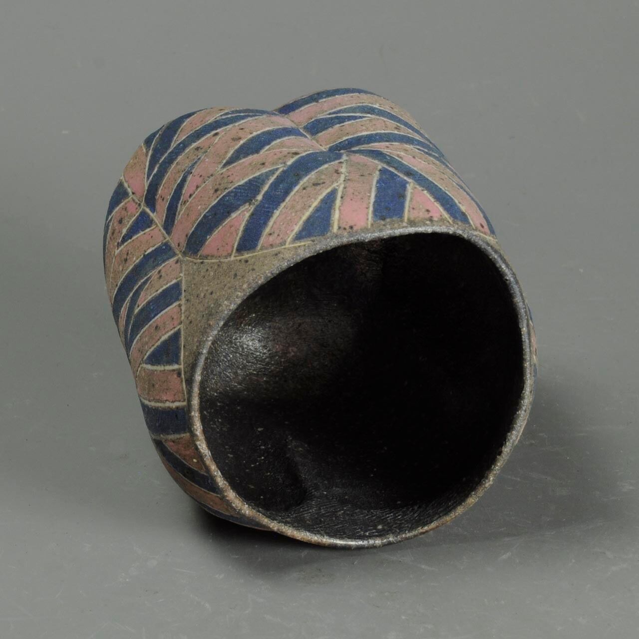 It is an inlaid, colored cup. The thin white lines are inlaid and the colored parts are pigmented.