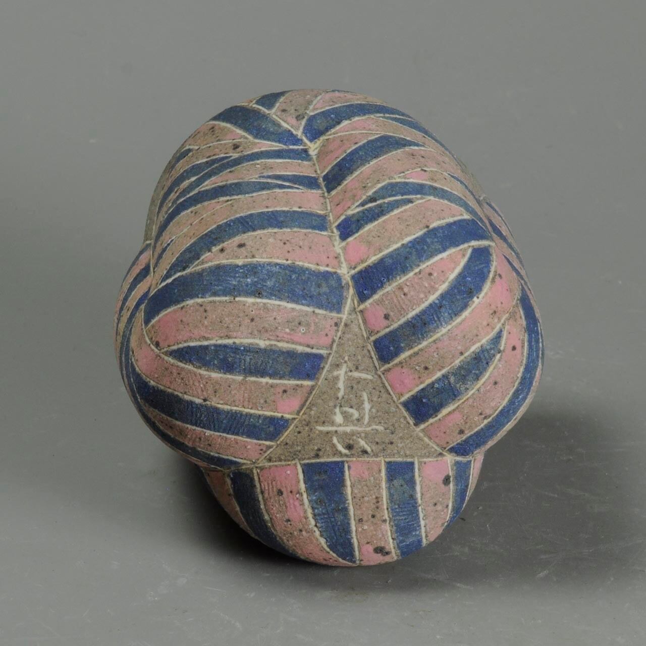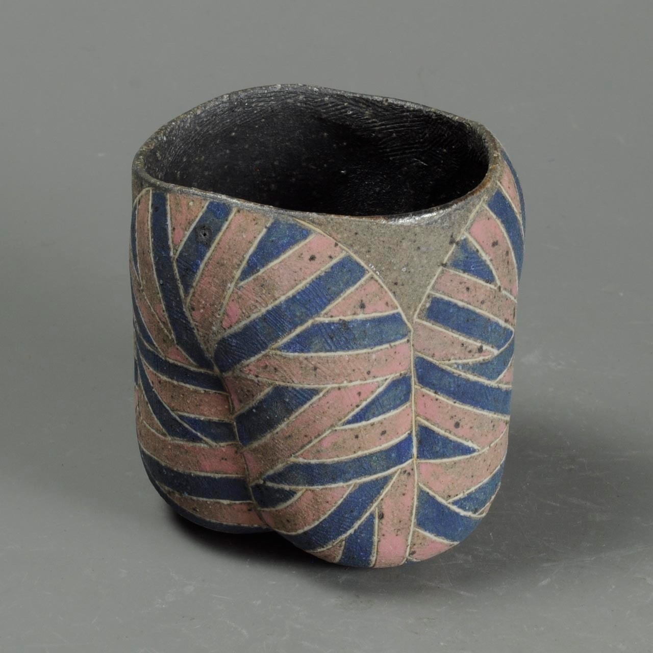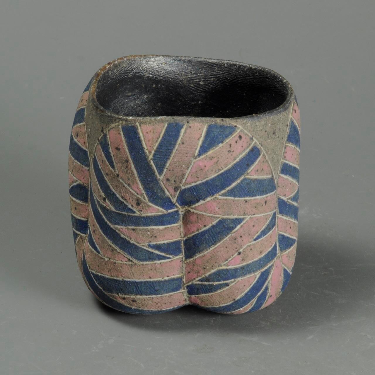 It is an inlaid, colored cup. The thin white lines are inlaid and the colored parts are pigmented.