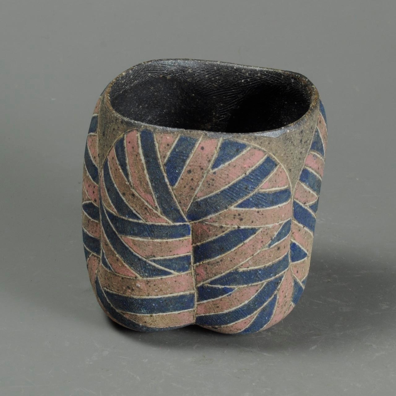 It is an inlaid, colored cup. The thin white lines are inlaid and the colored parts are pigmented.