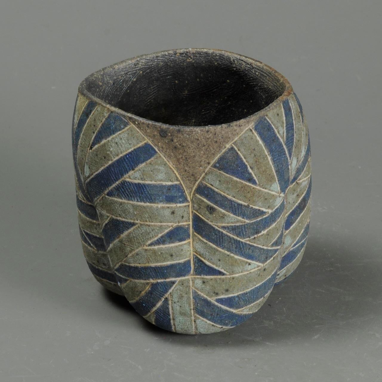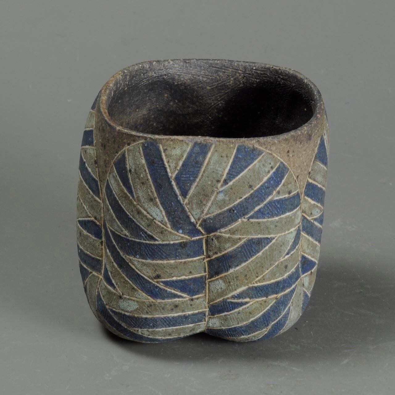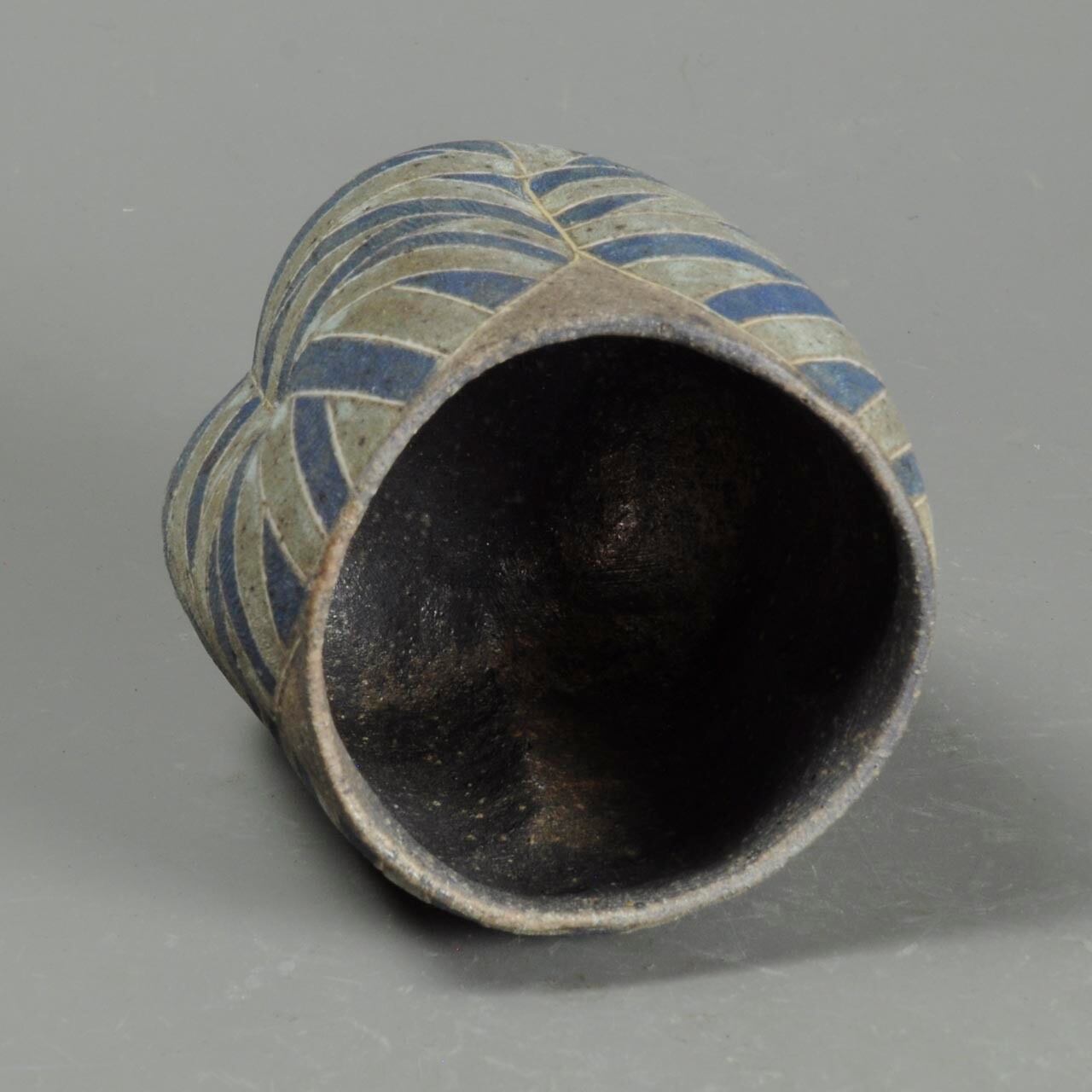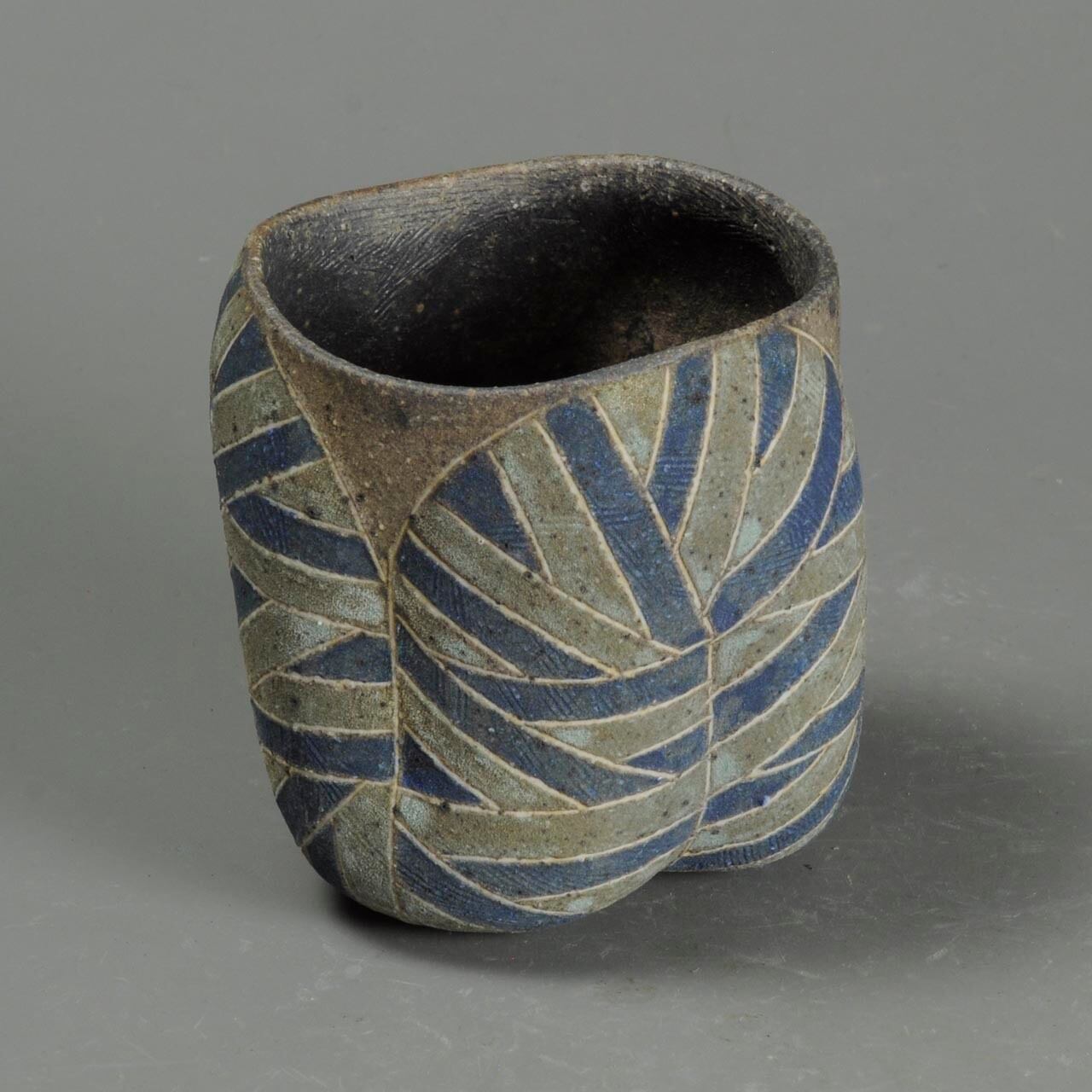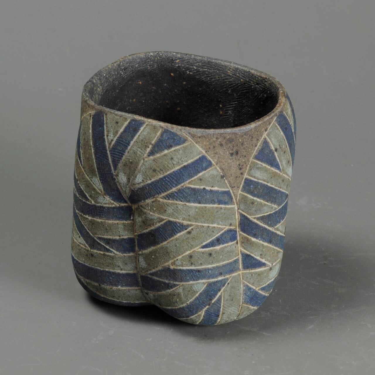 It is an inlaid, colored cup. The thin white lines are inlaid and the colored parts are pigmented.