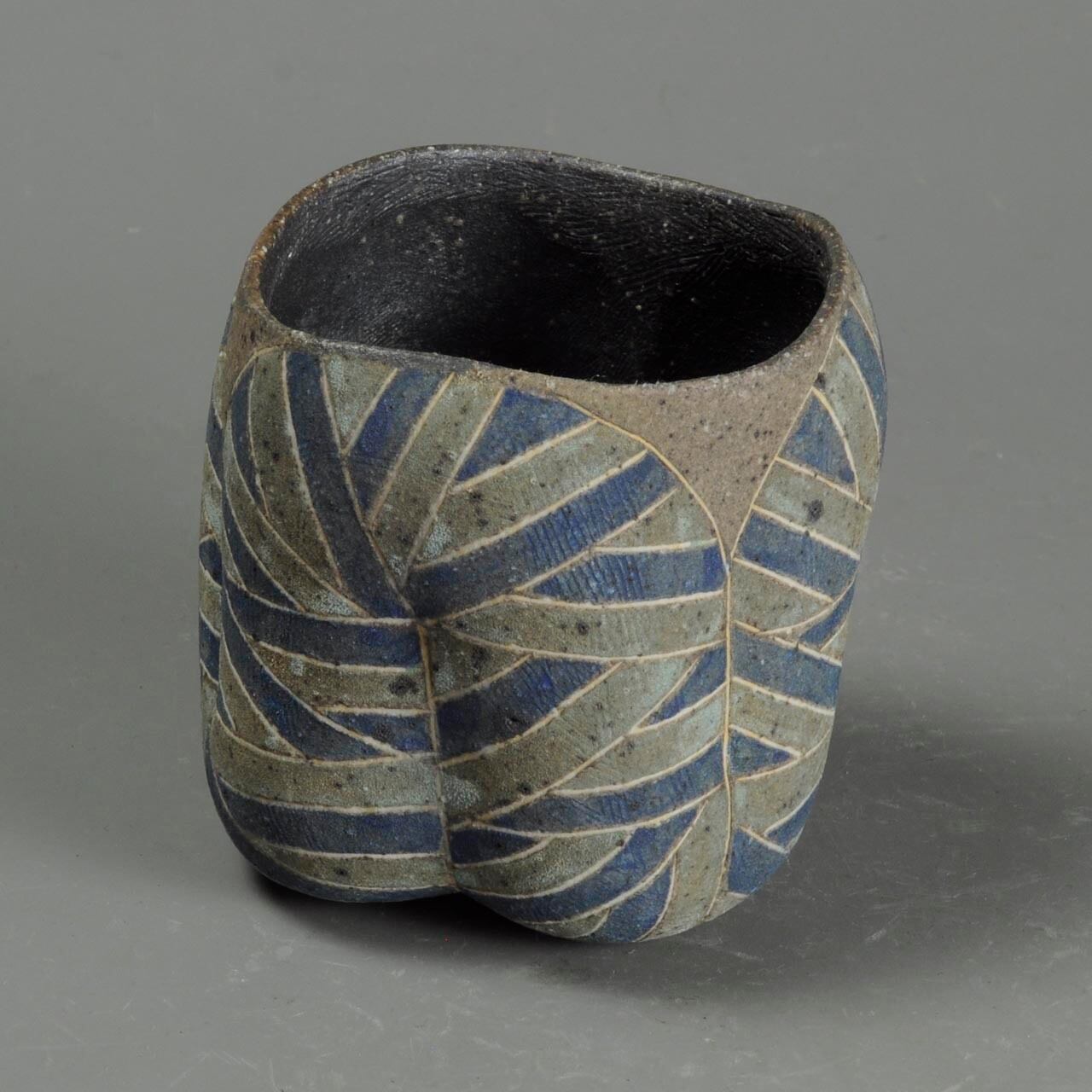 It is an inlaid, colored cup. The thin white lines are inlaid and the colored parts are pigmented.
