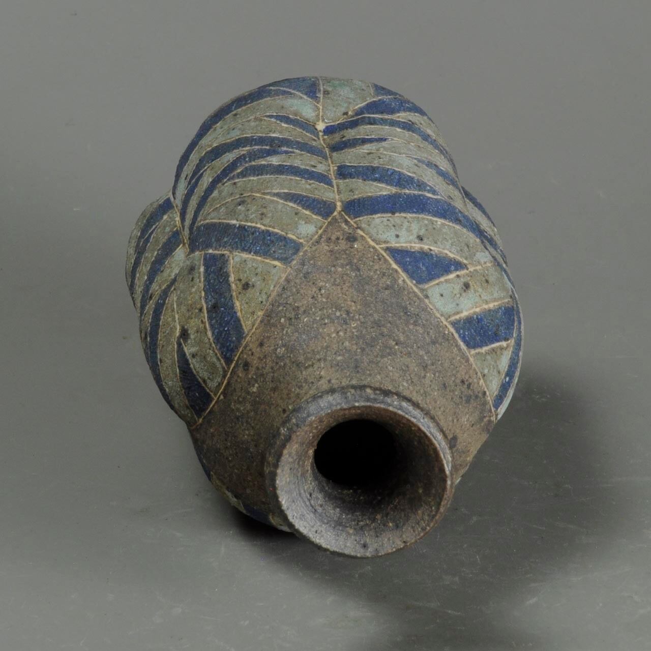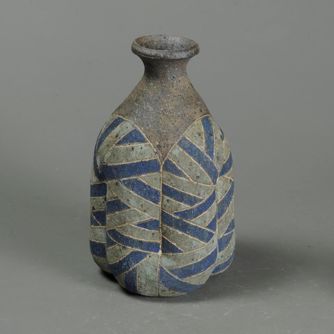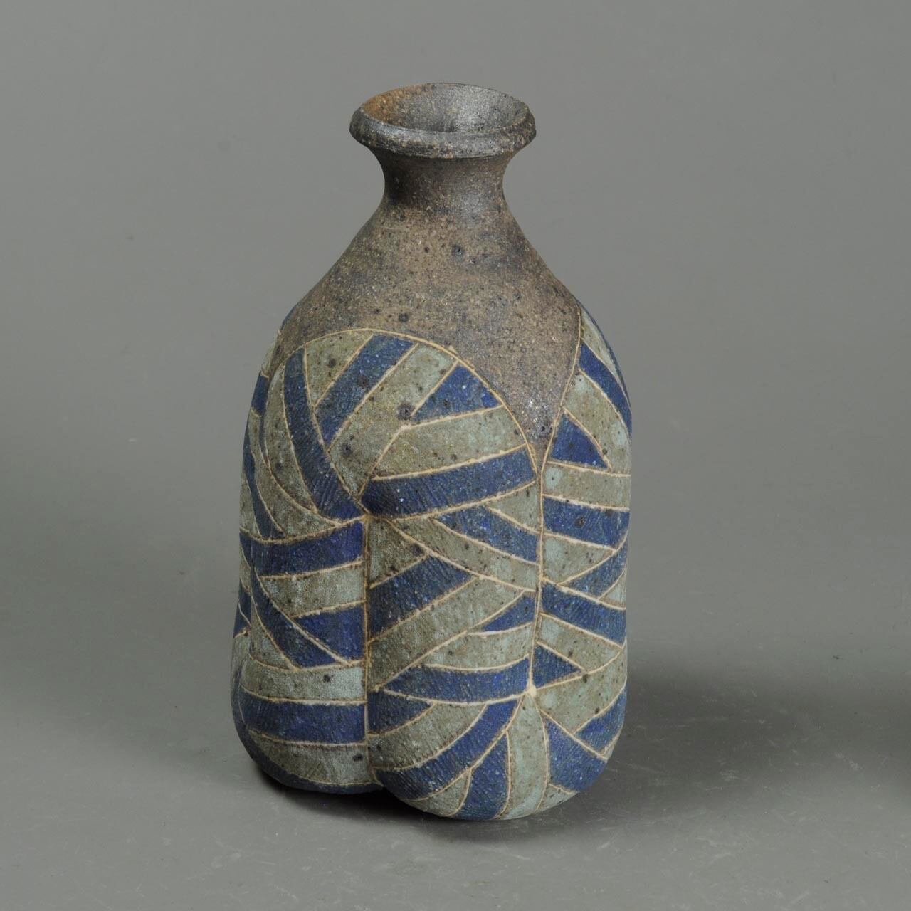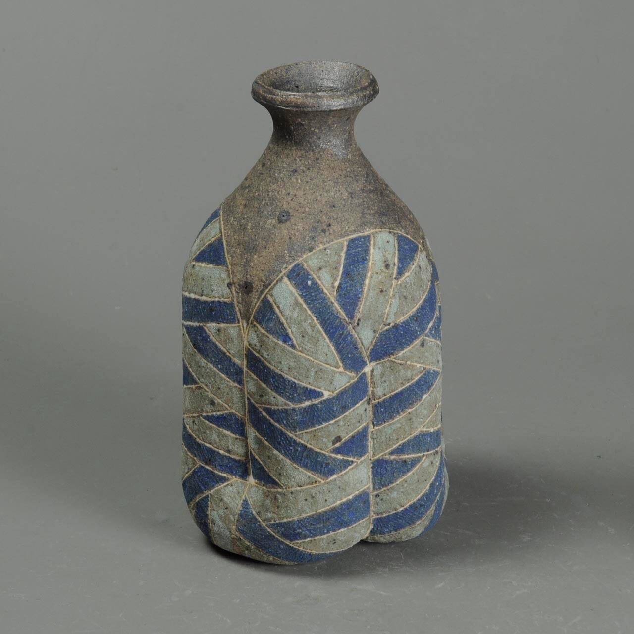 象嵌、彩色、焼きしめの徳利です。細い白い線が象嵌で色の部分は顔料が彩色してあります。