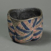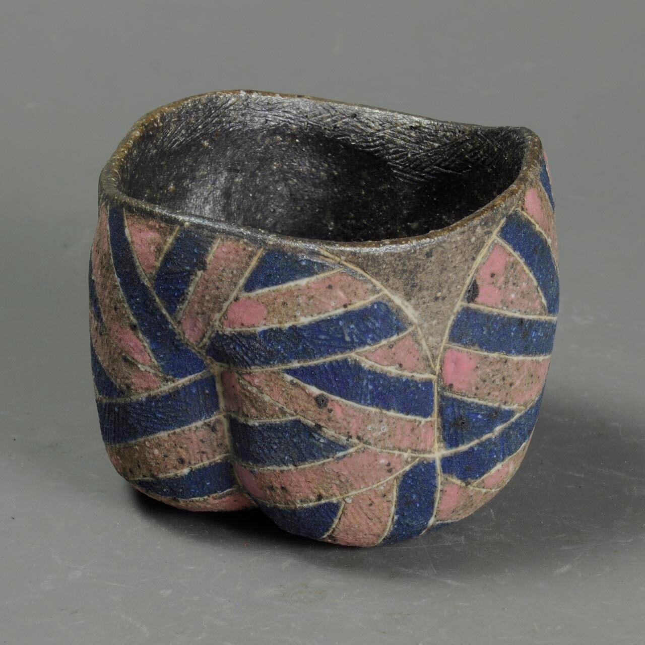 象嵌、彩色、焼きしめのぐい呑です。手びねり(玉作り)で成形しています。