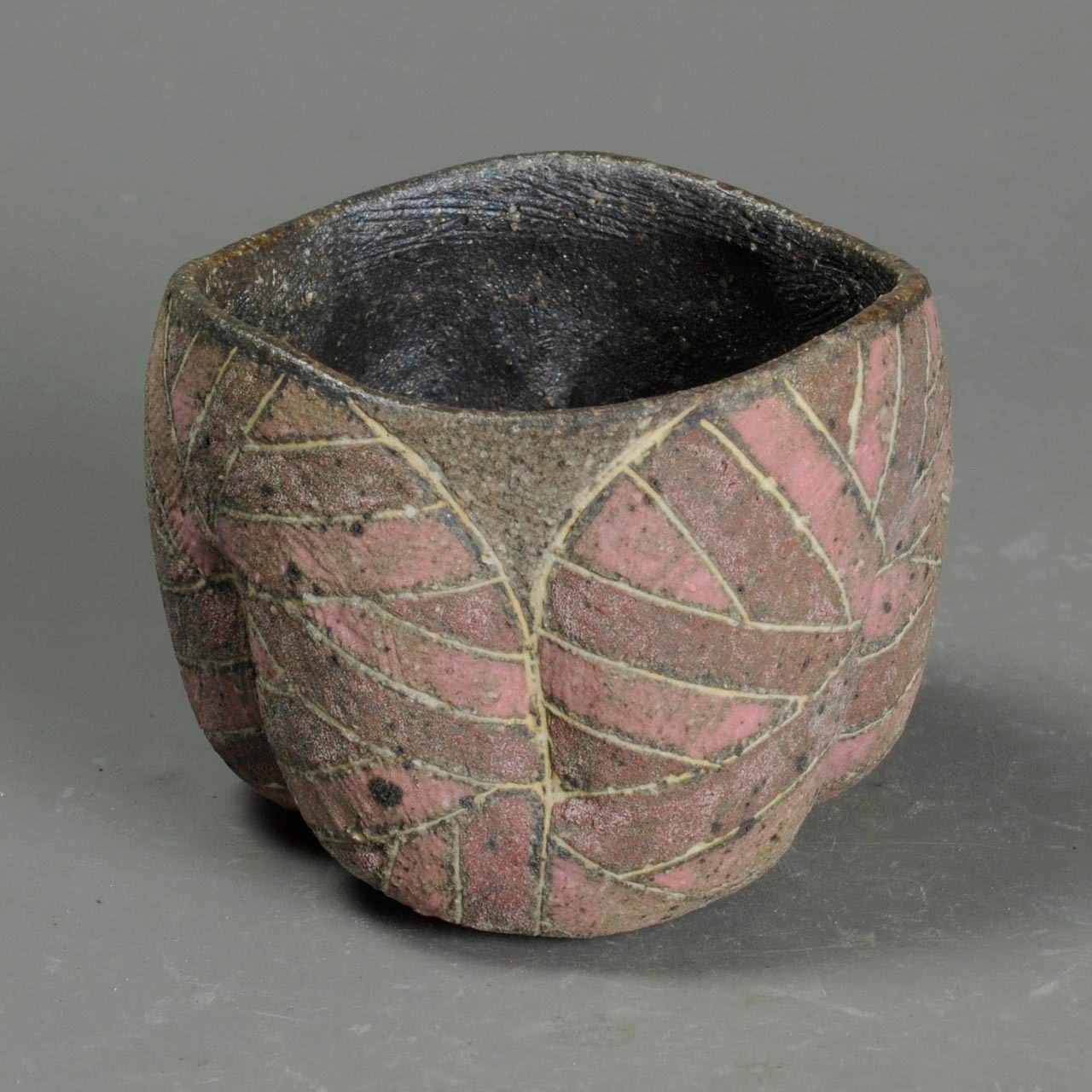 象嵌、彩色、焼きしめのぐい呑です。手びねり(玉作り)で成形しています。