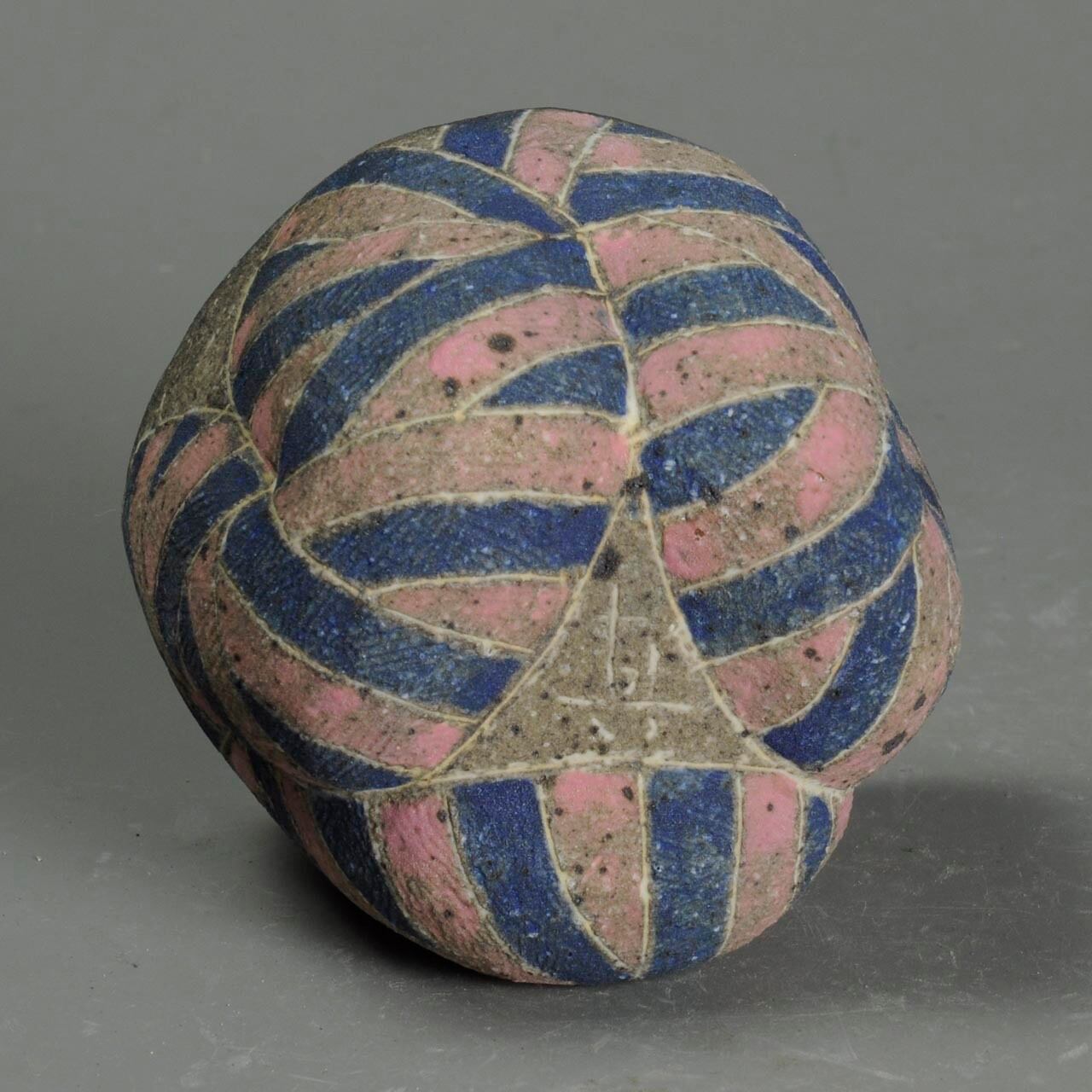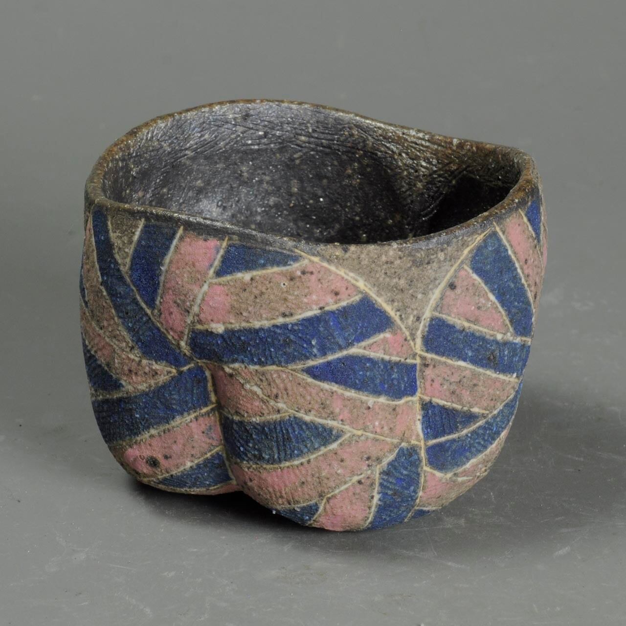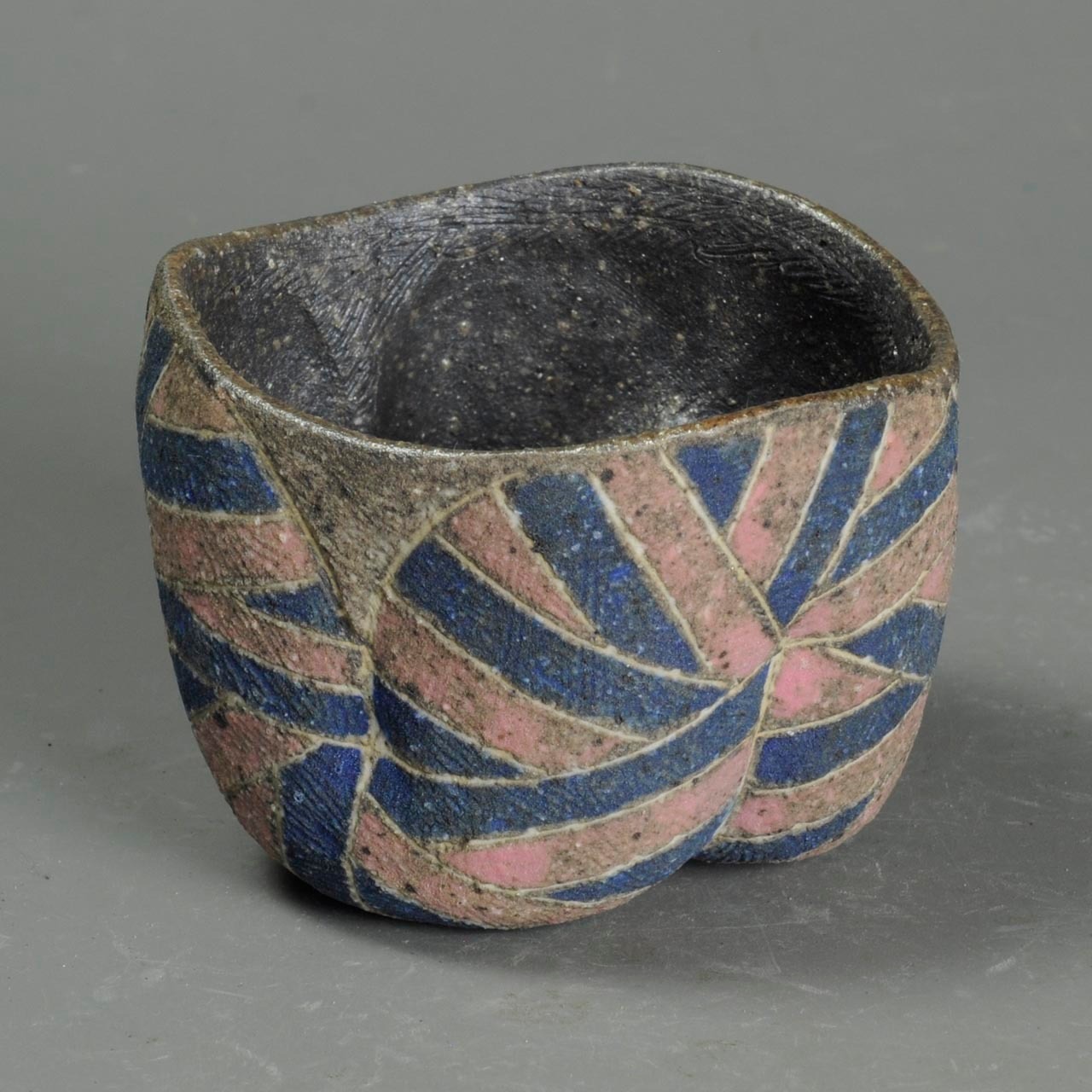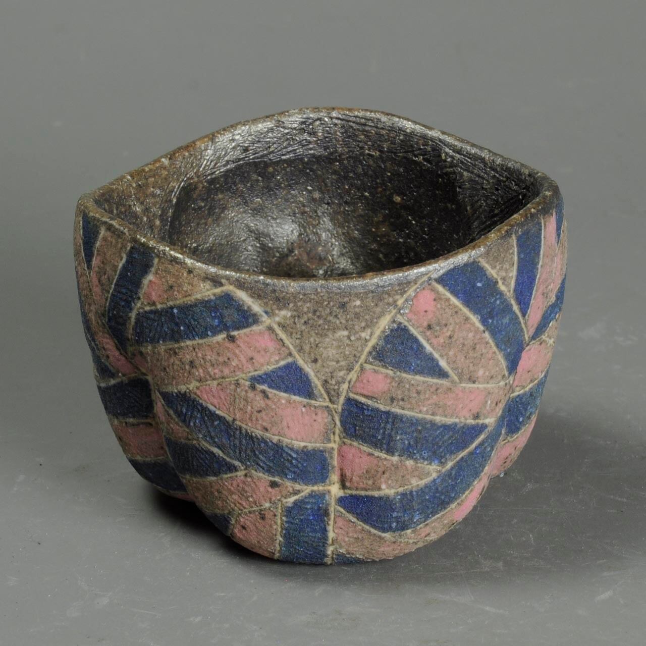 象嵌、彩色、焼きしめのぐい呑です。手びねり(玉作り)で成形しています。