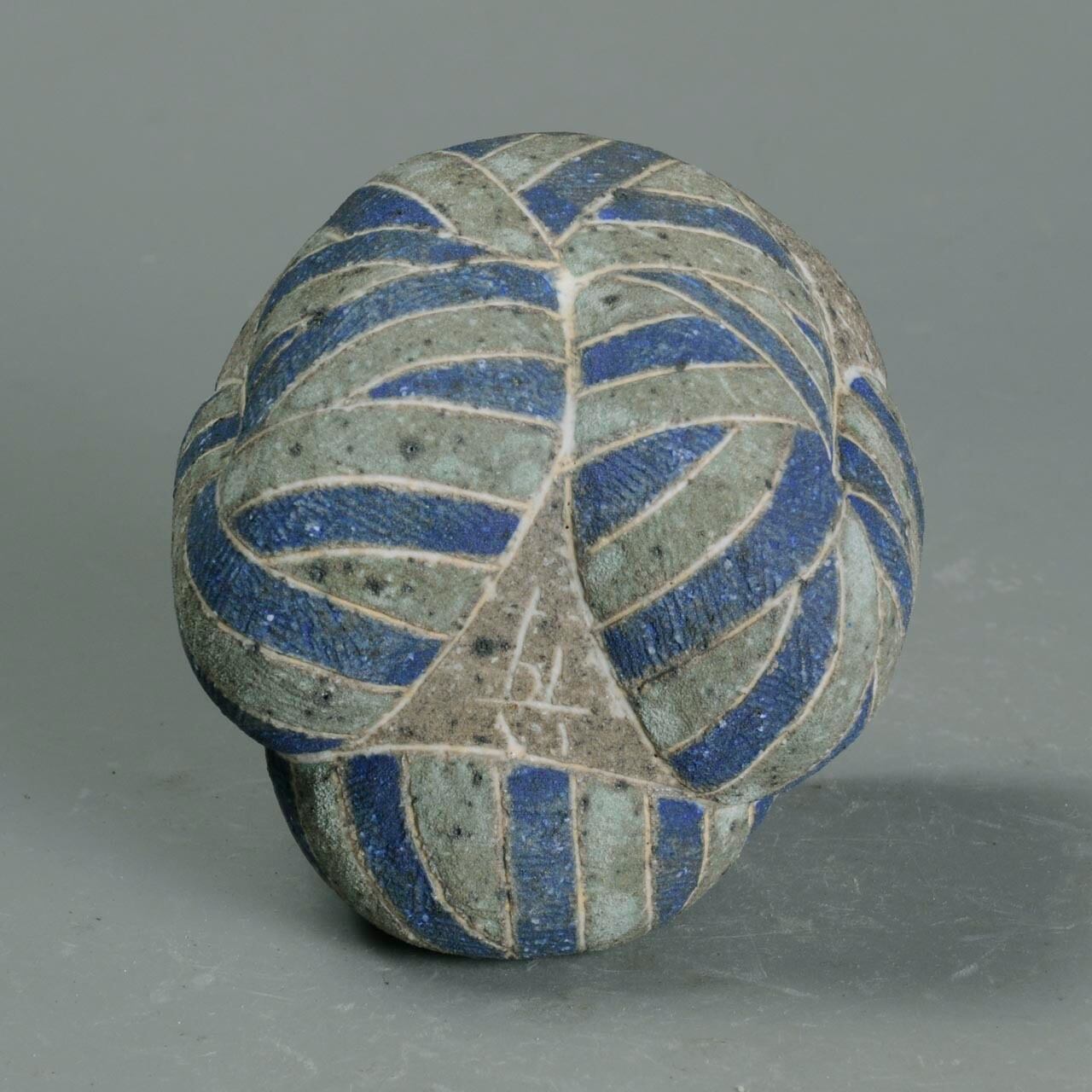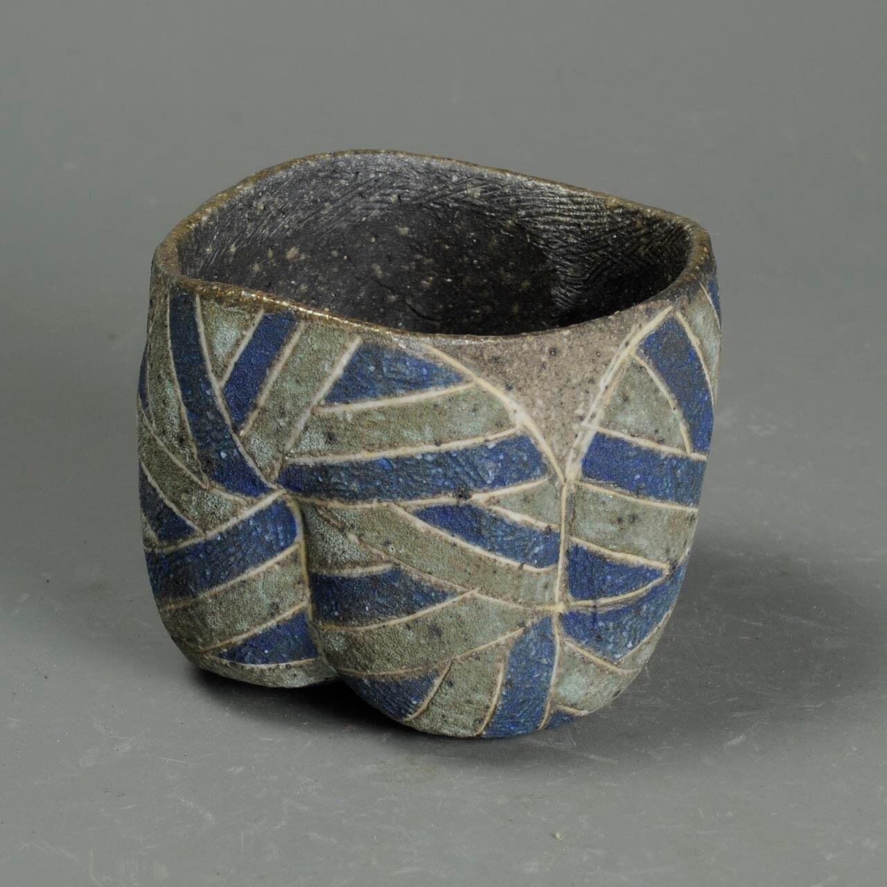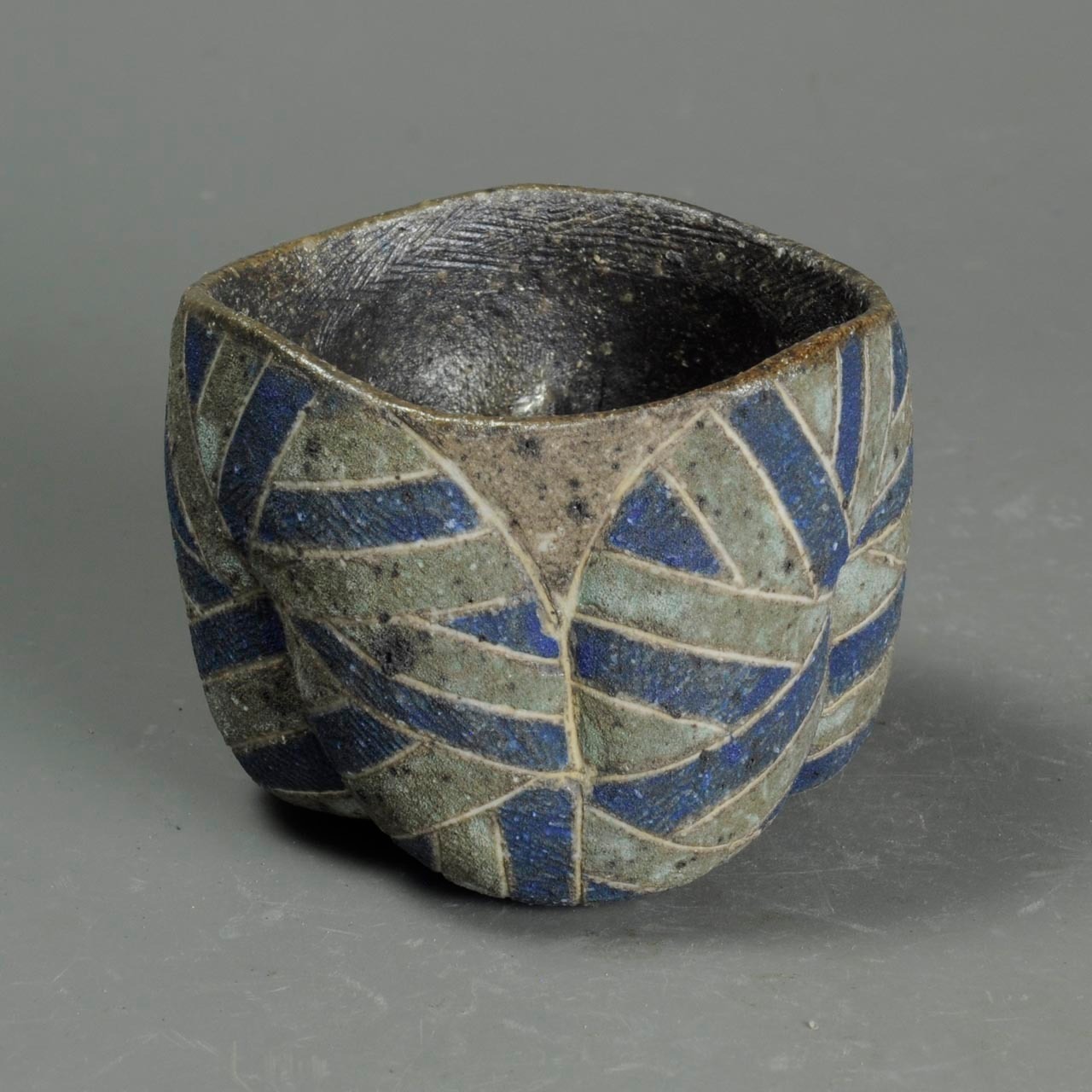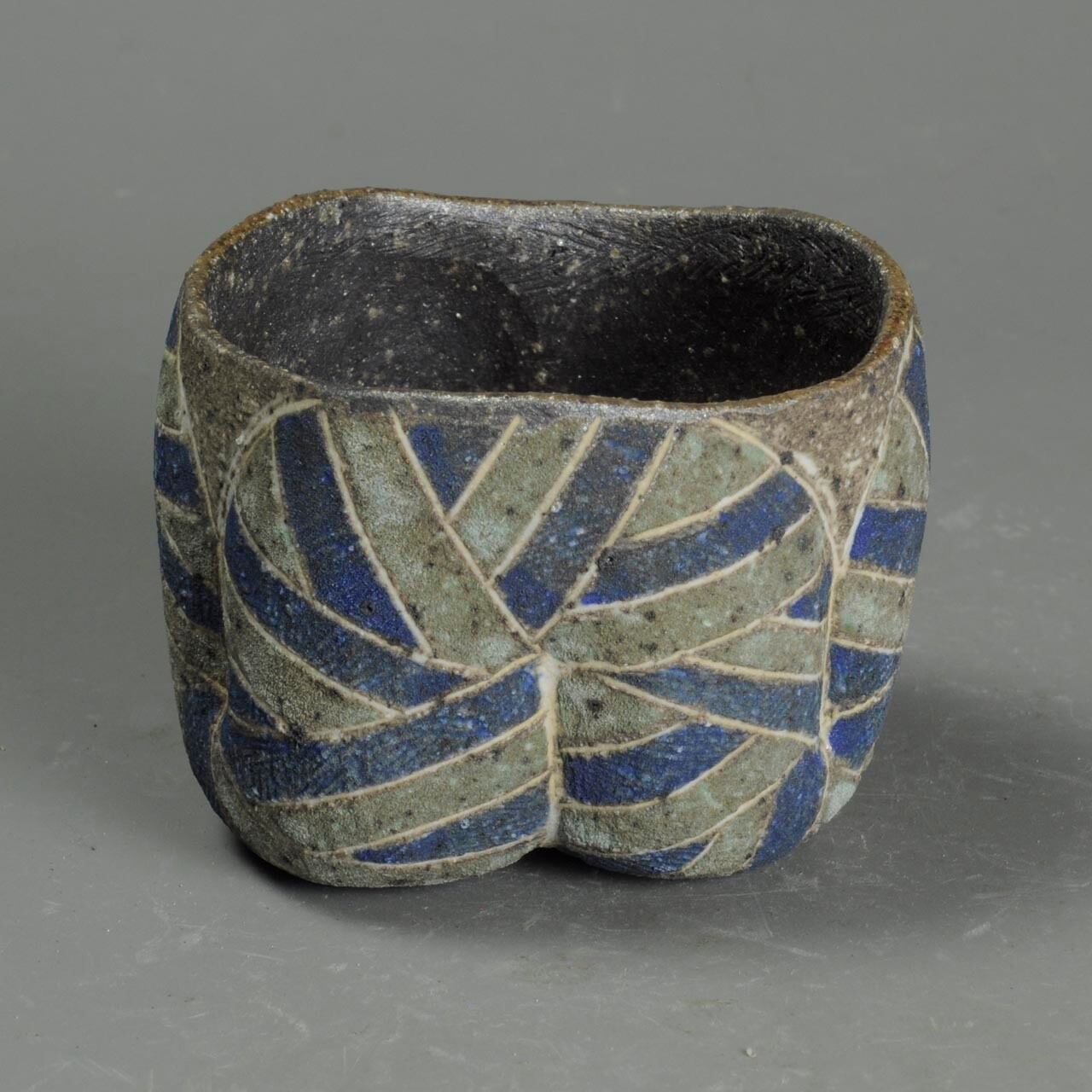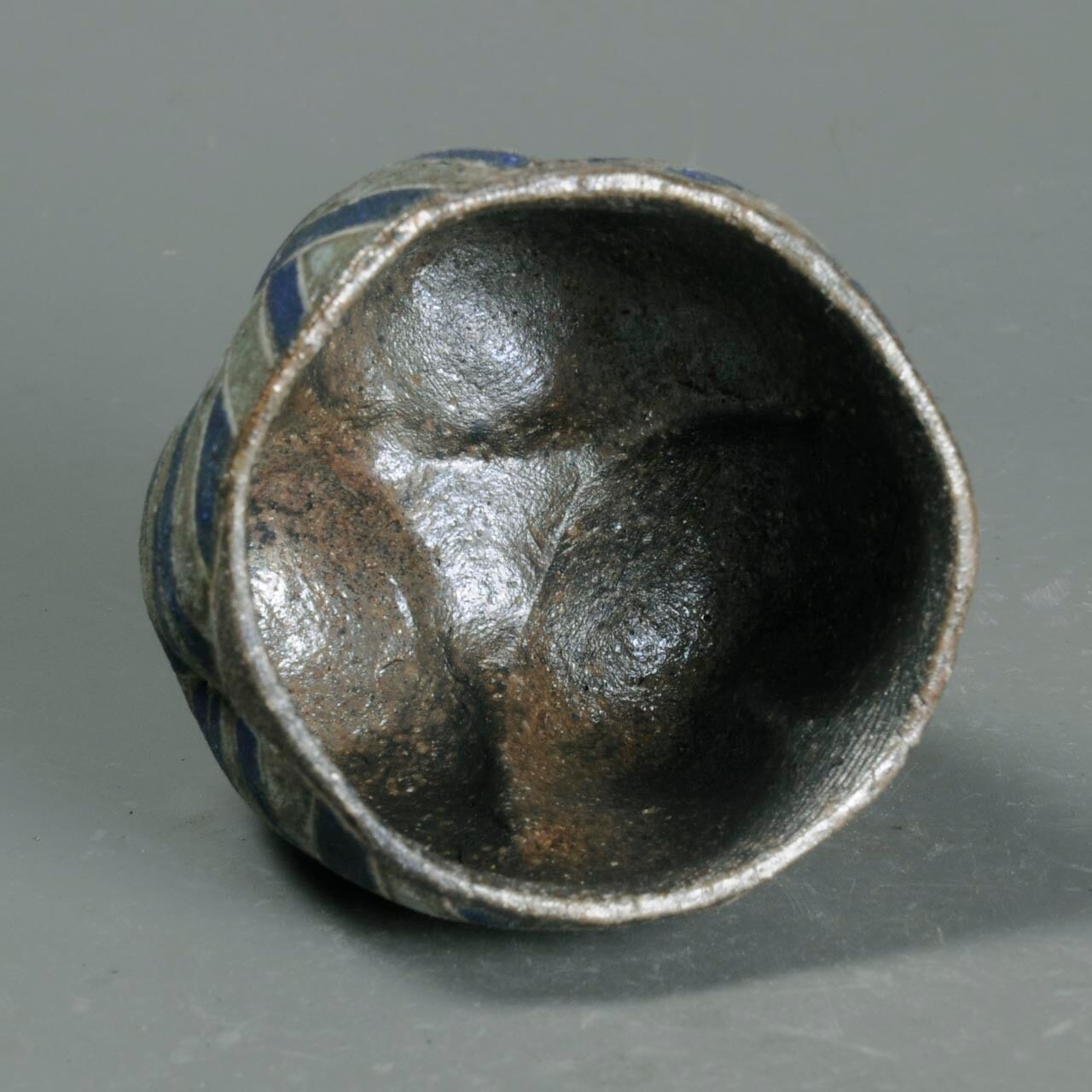 象嵌、彩色、焼きしめのぐい呑です。手びねり(玉作り)で成形しています。
