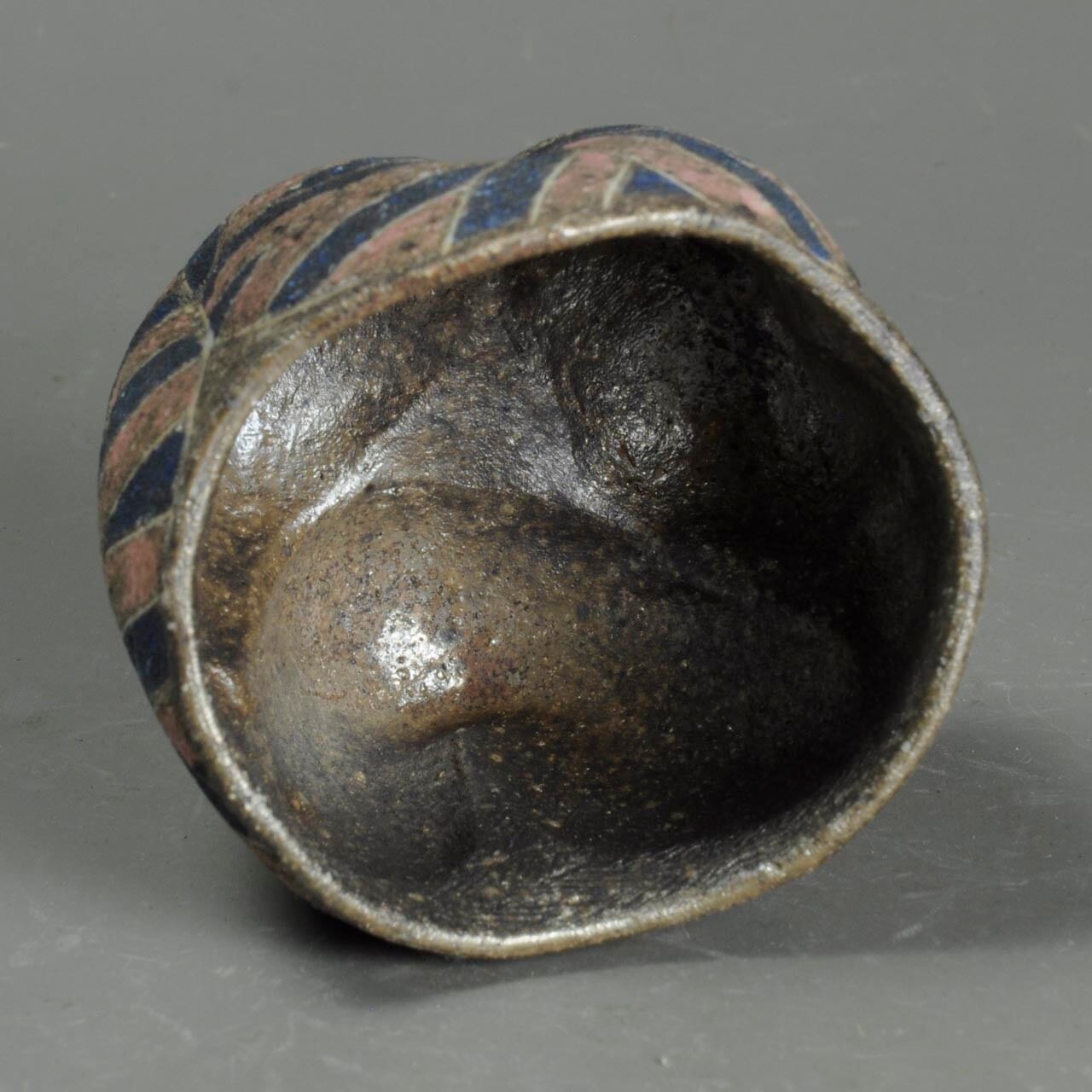 象嵌、彩色、焼きしめのぐい呑です。手びねり(玉作り)で成形しています。