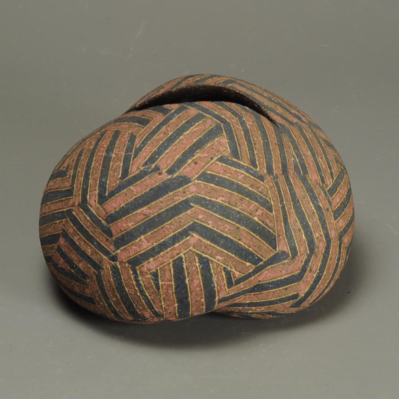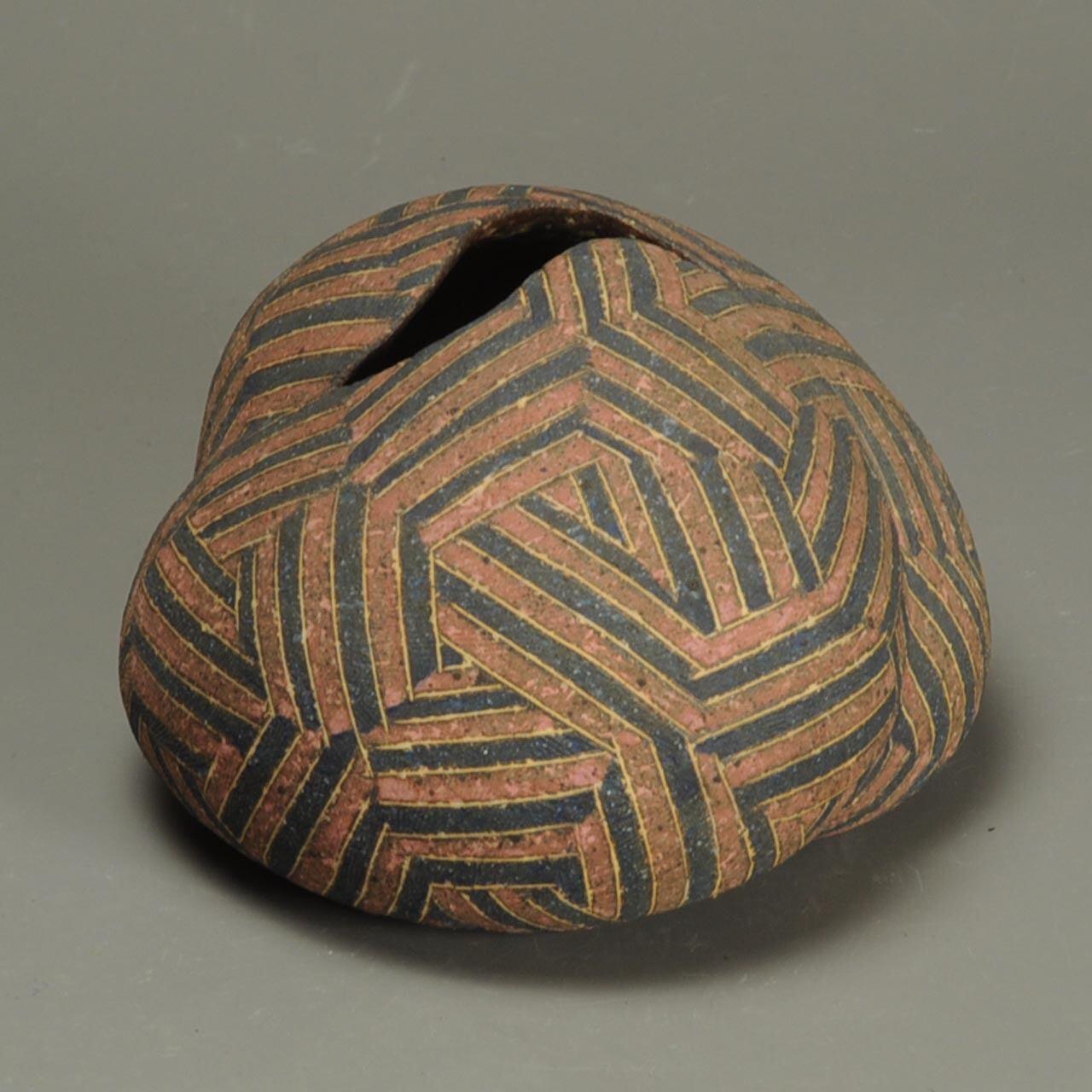 象嵌、彩色、焼きしめの壷です。細い白い線が象嵌で色の部分は顔料が彩色してあります。