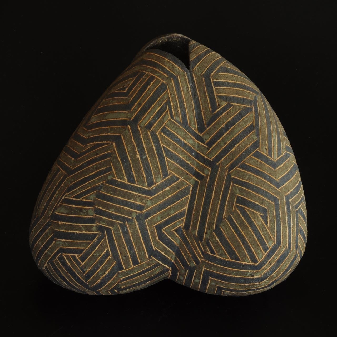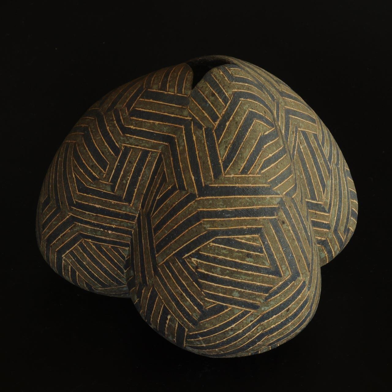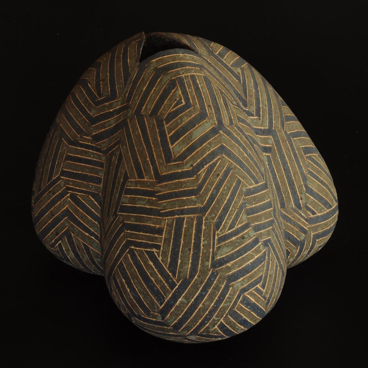 象嵌、彩色、焼きしめの壷です。細い白い線が象嵌で色の部分は顔料が彩色してあります。