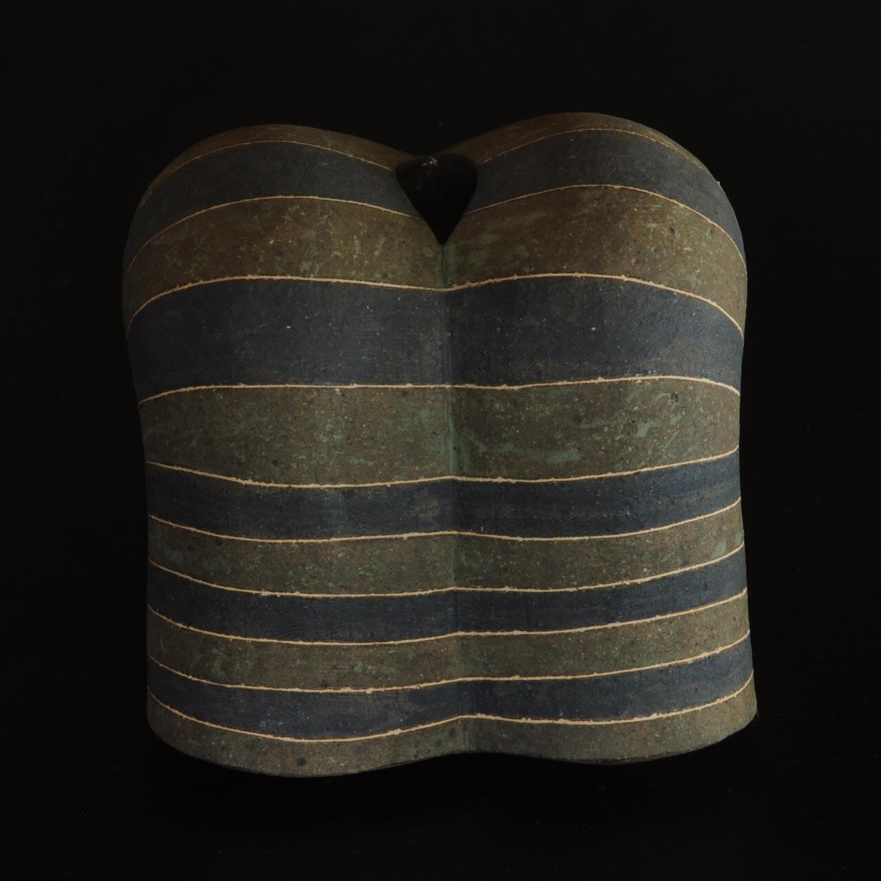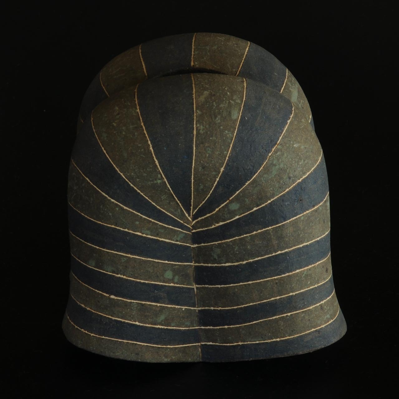 象嵌、彩色、焼きしめの壷です。細い白い線が象嵌で色の部分は顔料が彩色してあります。