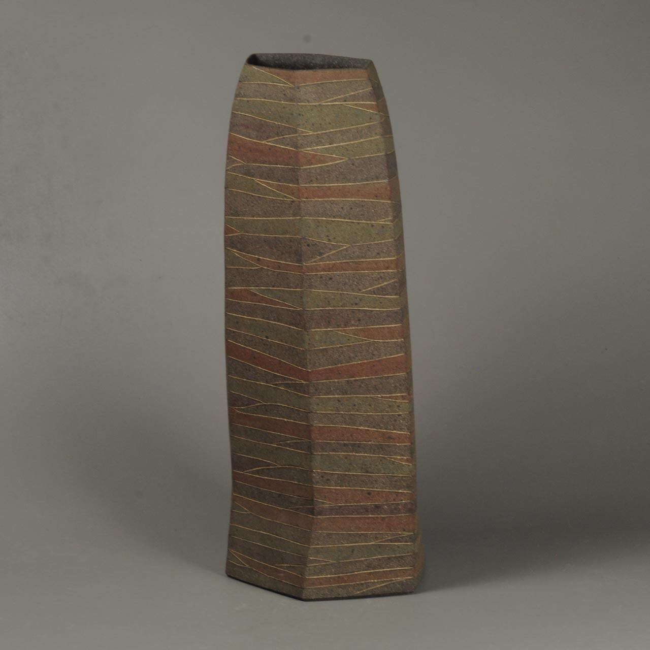 象嵌、彩色、焼きしめの壷です。細い白い線が象嵌で色の部分は顔料が彩色してあります。