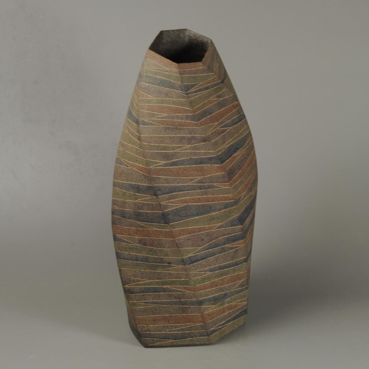 象嵌、彩色、焼きしめの壷です。細い白い線が象嵌で色の部分は顔料が彩色してあります。