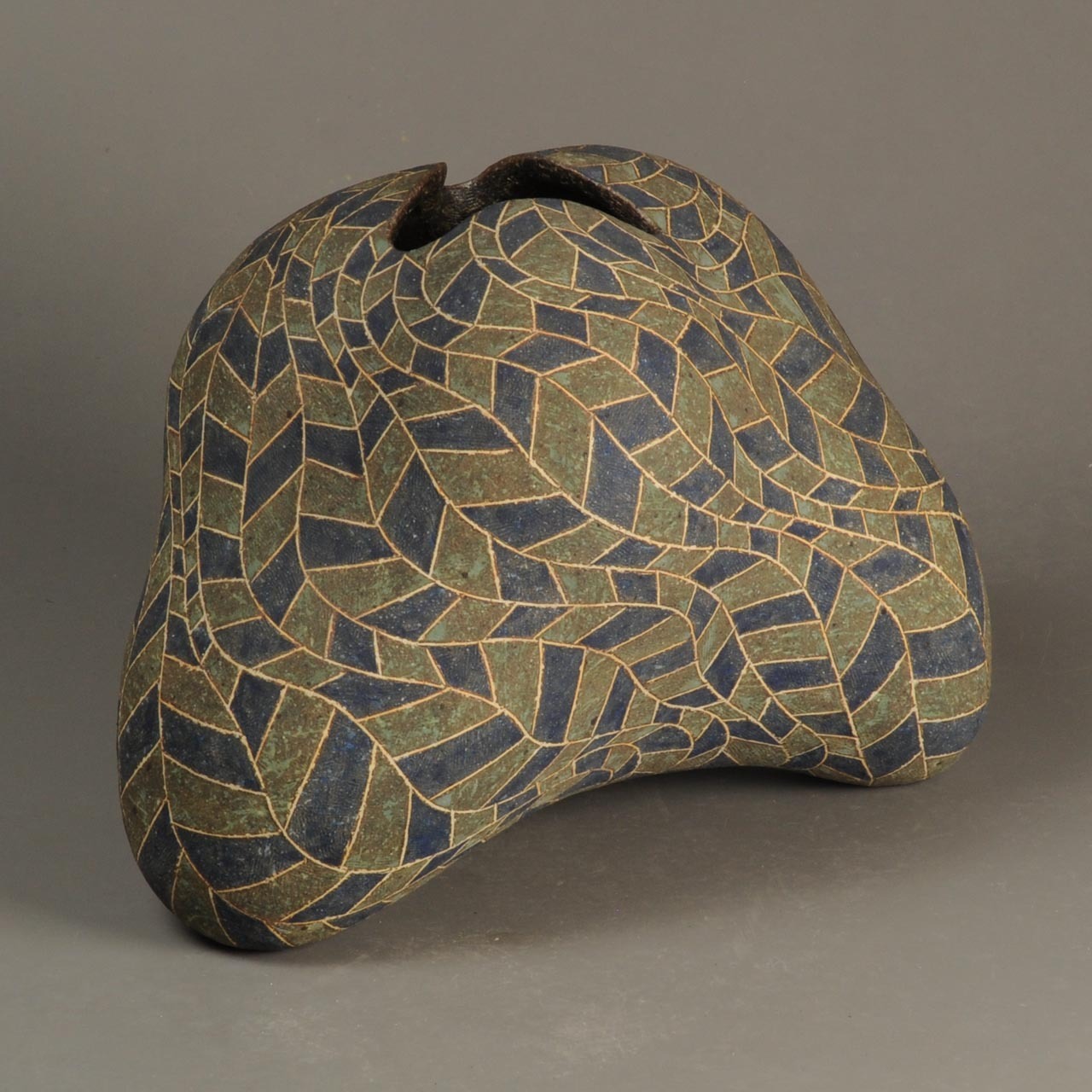 象嵌、彩色、焼きしめの壷です。細い白い線が象嵌で色の部分は顔料が彩色してあります。