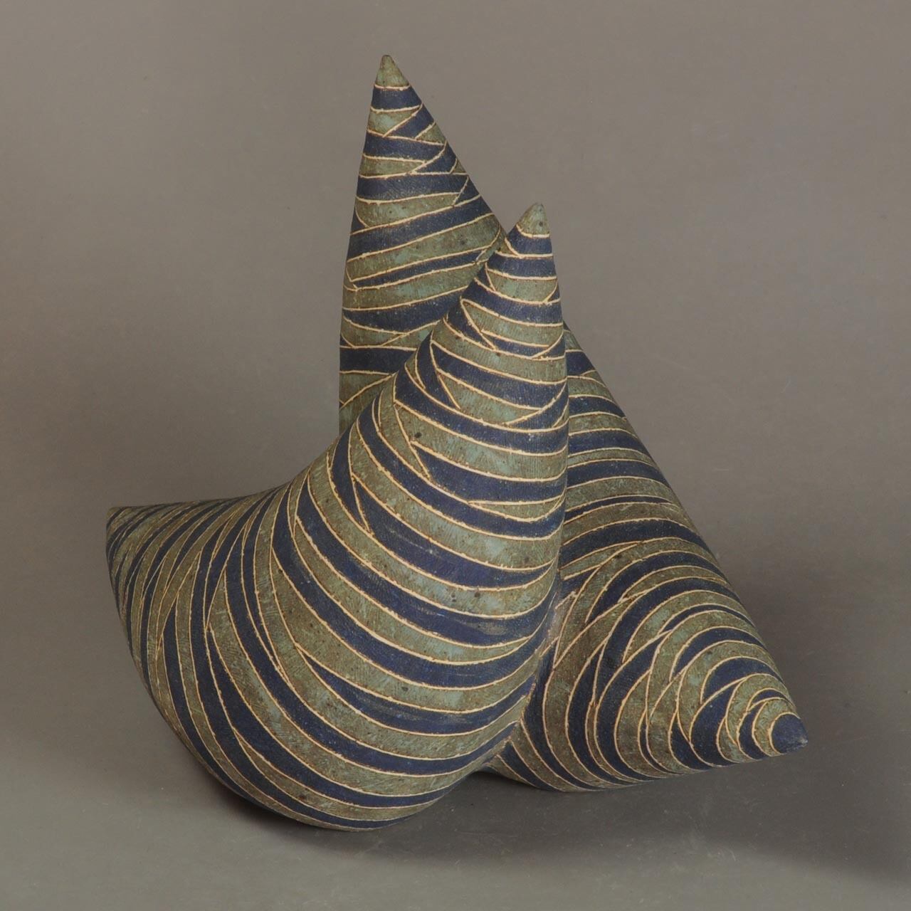 象嵌、彩色、焼きしめの壷です。細い白い線が象嵌で色の部分は顔料が彩色してあります。
