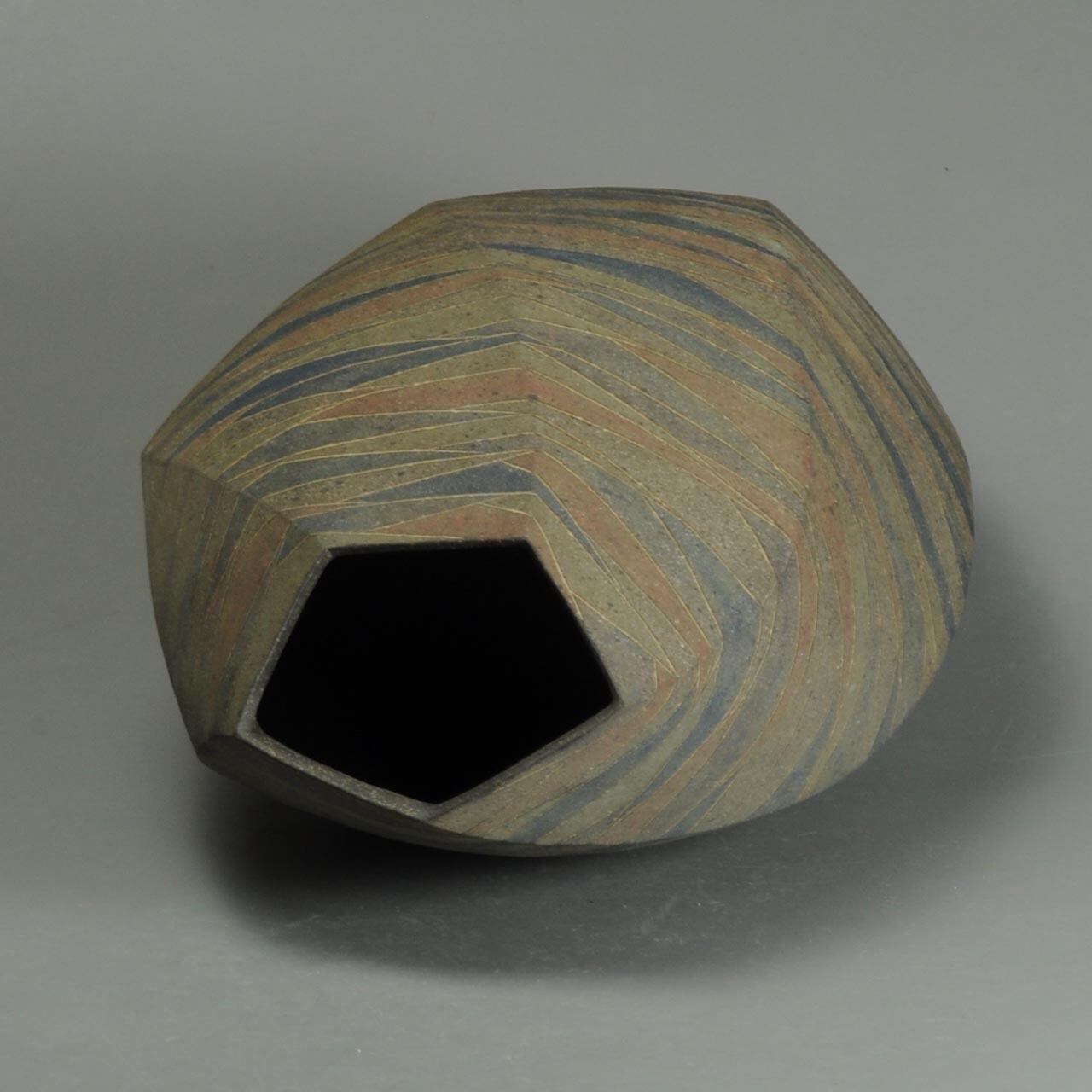 象嵌、彩色、焼きしめの壷です。細い白い線が象嵌で色の部分は顔料が彩色してあります。