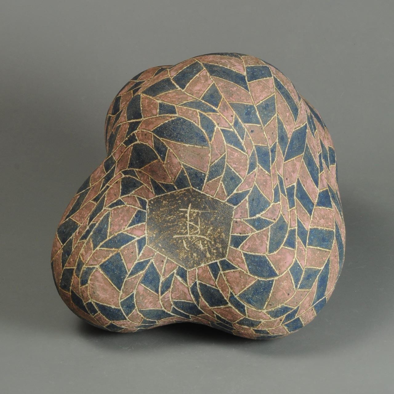 象嵌、彩色、焼きしめの壷です。細い白い線が象嵌で色の部分は顔料が彩色してあります。