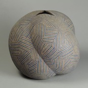象嵌、彩色、焼きしめの壷です。細い白い線が象嵌で色の部分は顔料が彩色してあります。