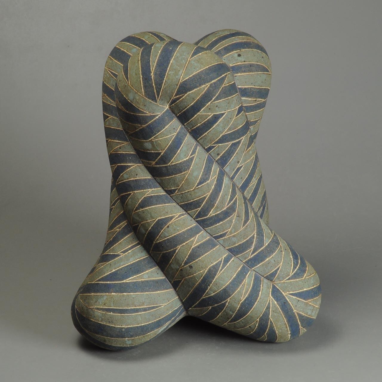 象嵌、彩色、焼きしめの壷です。細い白い線が象嵌で色の部分は顔料が彩色してあります。