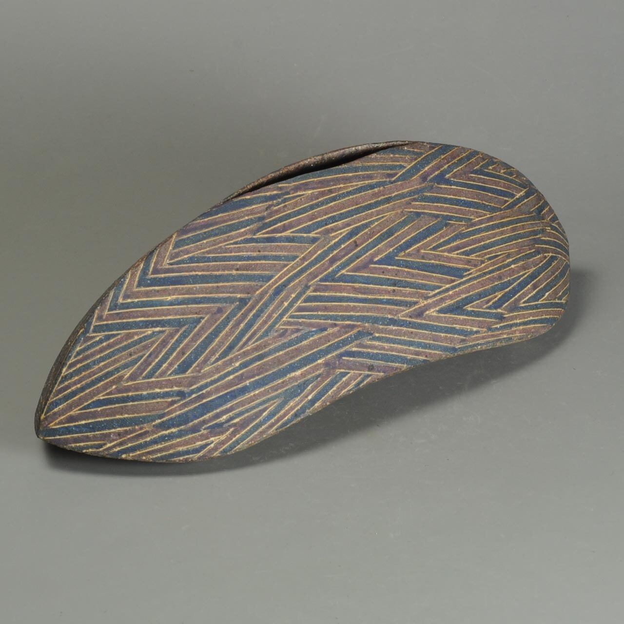 象嵌、彩色、焼きしめの壷です。細い白い線が象嵌で色の部分は顔料が彩色してあります。