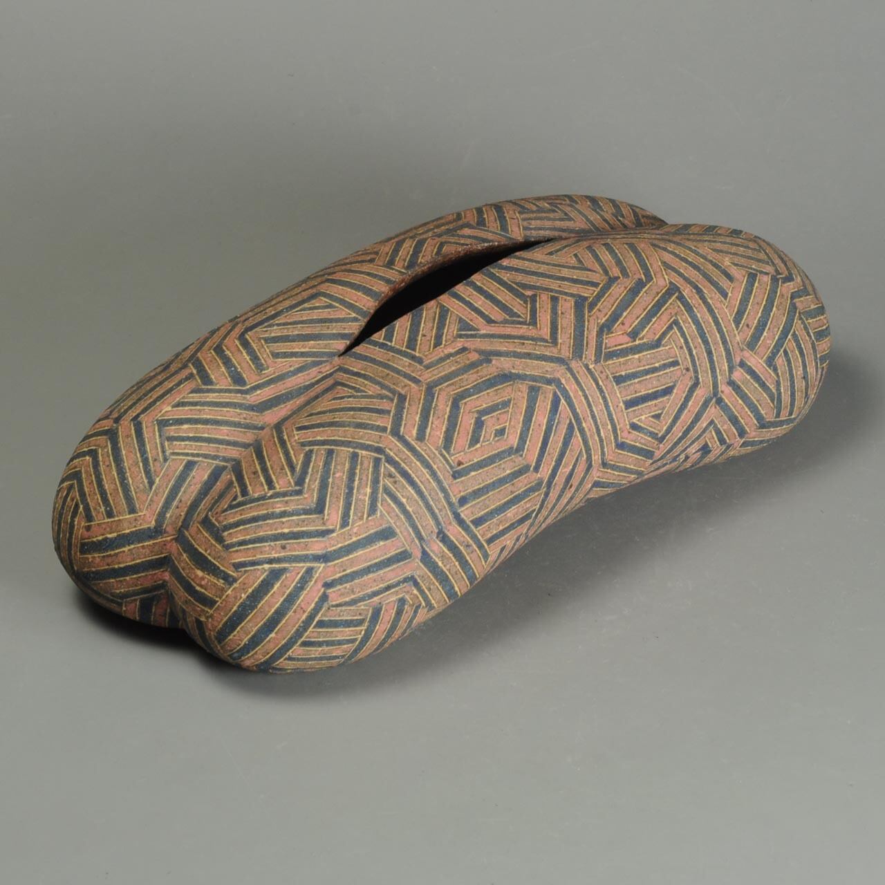象嵌、彩色、焼きしめの壷です。細い白い線が象嵌で色の部分は顔料が彩色してあります。