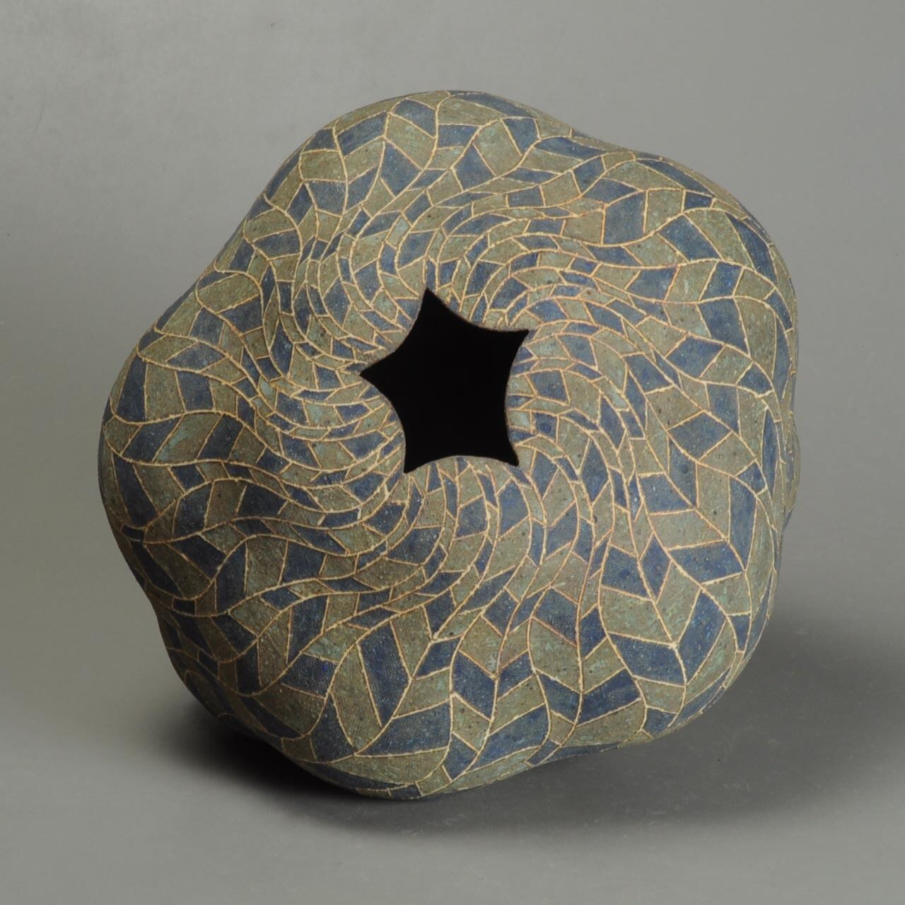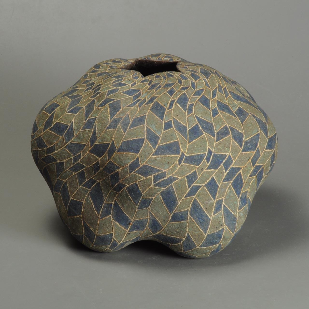象嵌、彩色、焼きしめの壷です。細い白い線が象嵌で色の部分は顔料が彩色してあります。