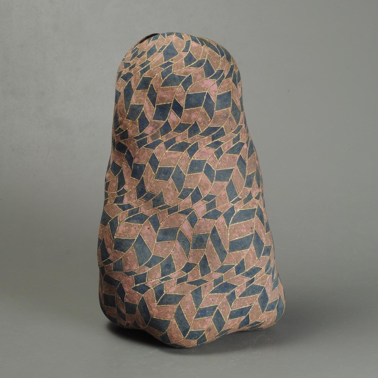 象嵌、彩色、焼きしめの壷です。細い白い線が象嵌で色の部分は顔料が彩色してあります。