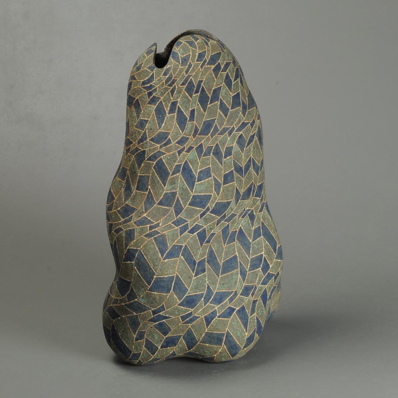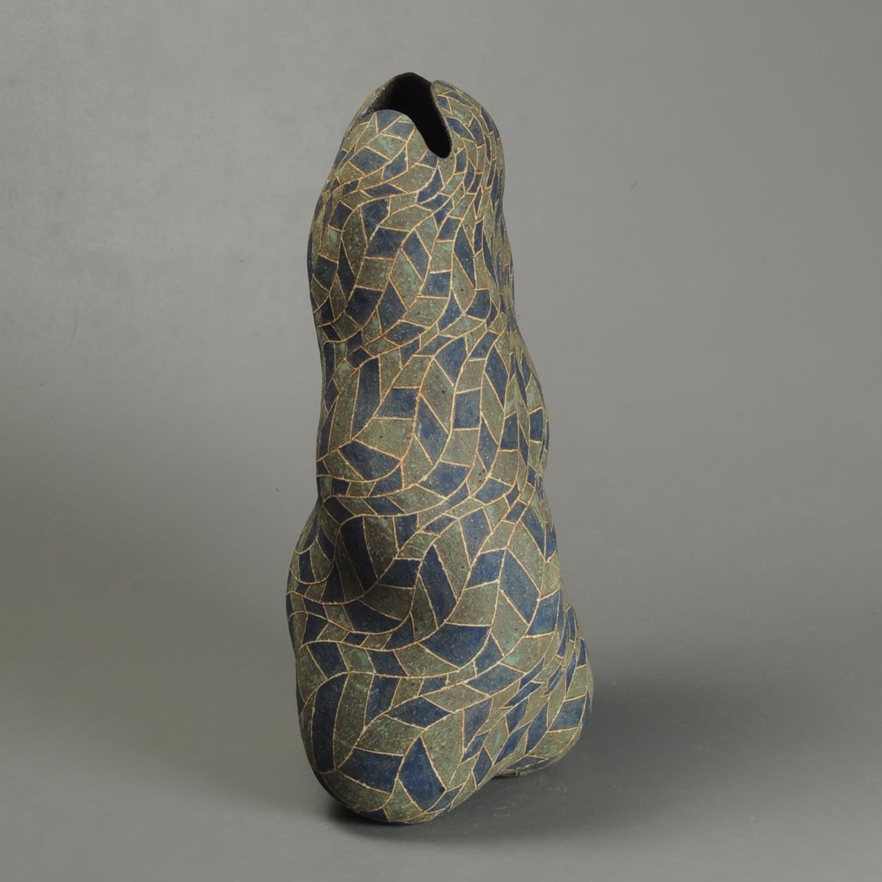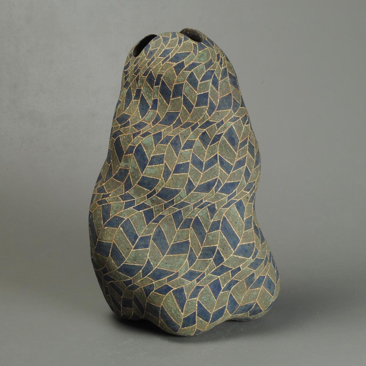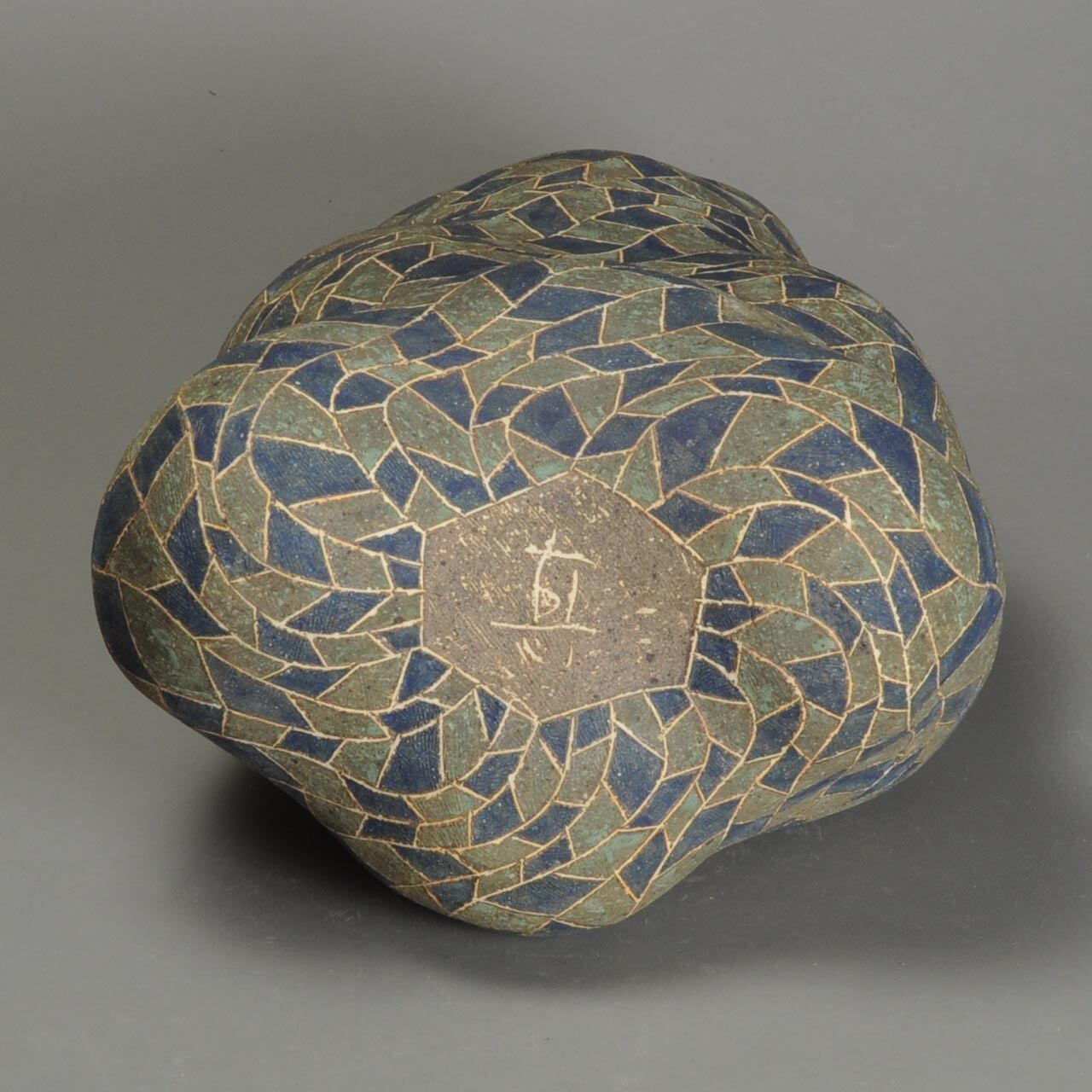 象嵌、彩色、焼きしめの壷です。細い白い線が象嵌で色の部分は顔料が彩色してあります。
