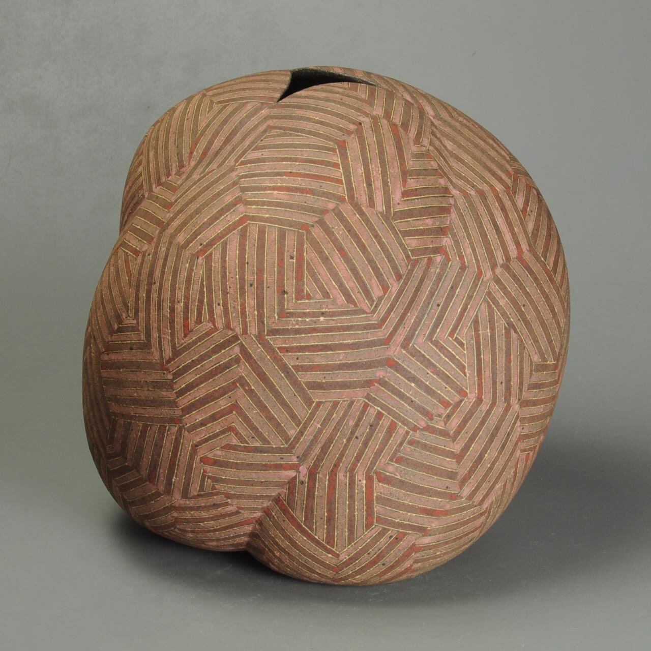 象嵌、彩色、焼きしめの壷です。細い白い線が象嵌で色の部分は顔料が彩色してあります。