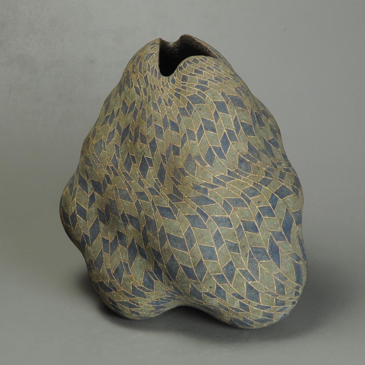 象嵌、彩色、焼きしめの壷です。細い白い線が象嵌で色の部分は顔料が彩色してあります。