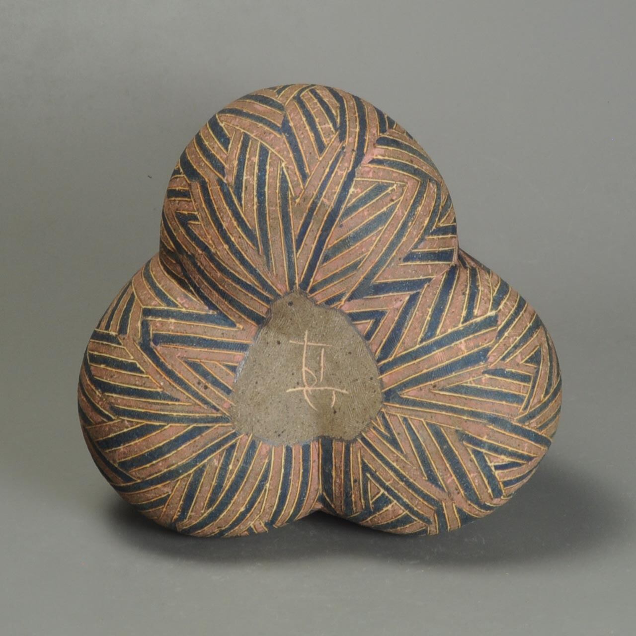 象嵌、彩色、焼きしめの壷です。細い白い線が象嵌で色の部分は顔料が彩色してあります。