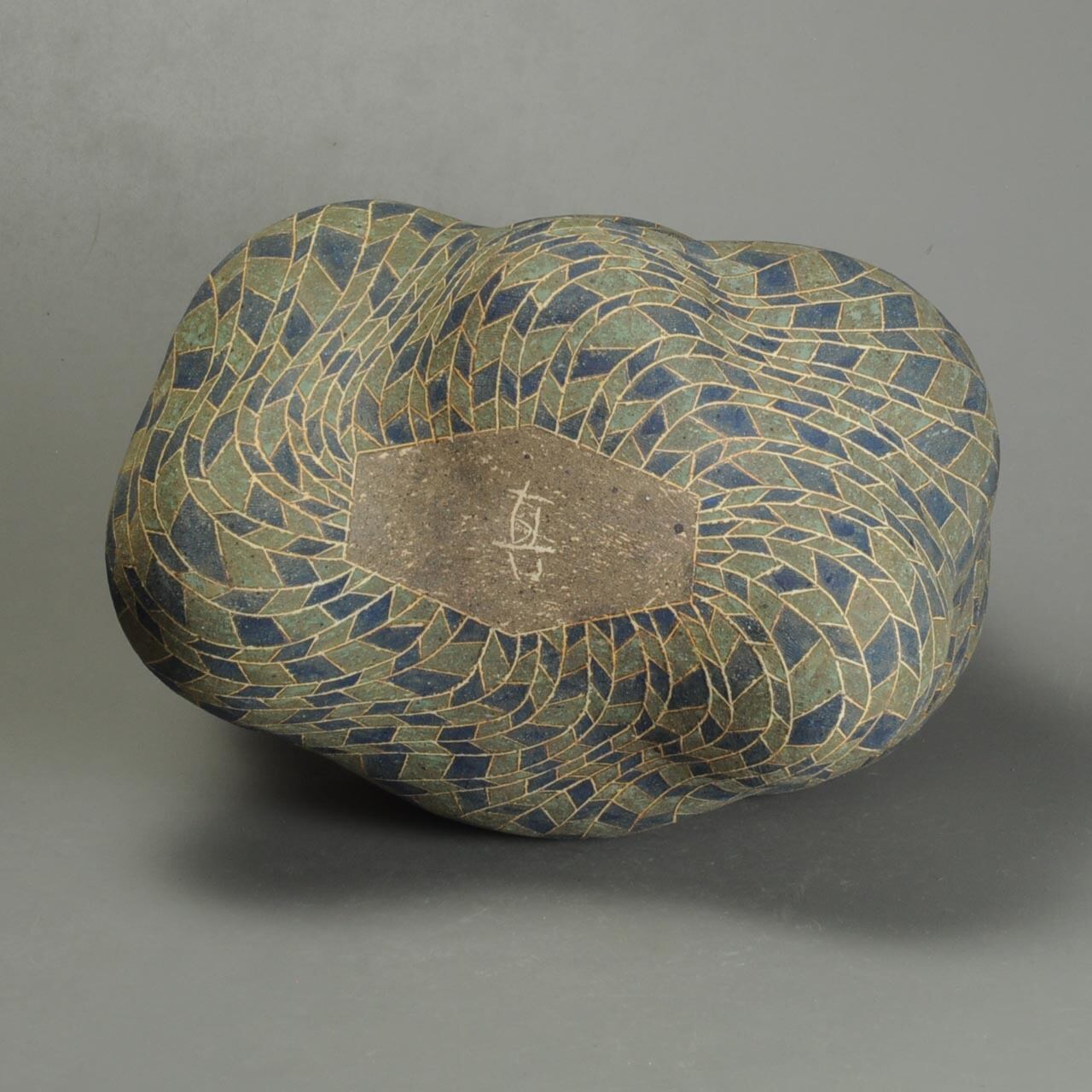 象嵌、彩色、焼きしめの壷です。細い白い線が象嵌で色の部分は顔料が彩色してあります。