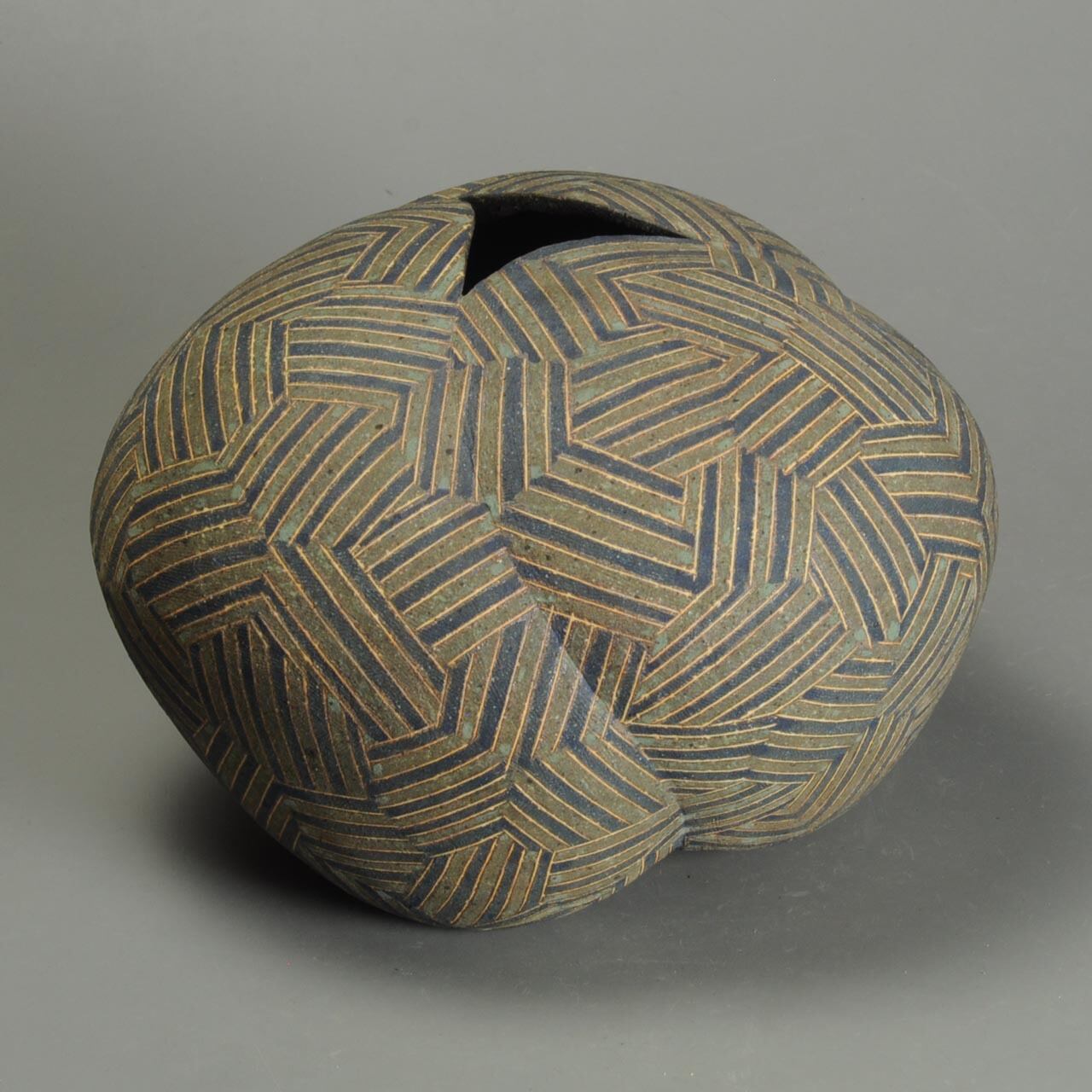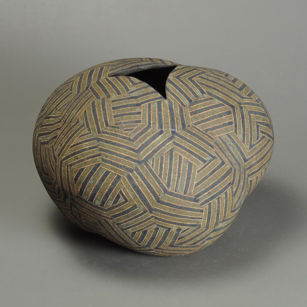 象嵌、彩色、焼きしめの壷です。細い白い線が象嵌で色の部分は顔料が彩色してあります。