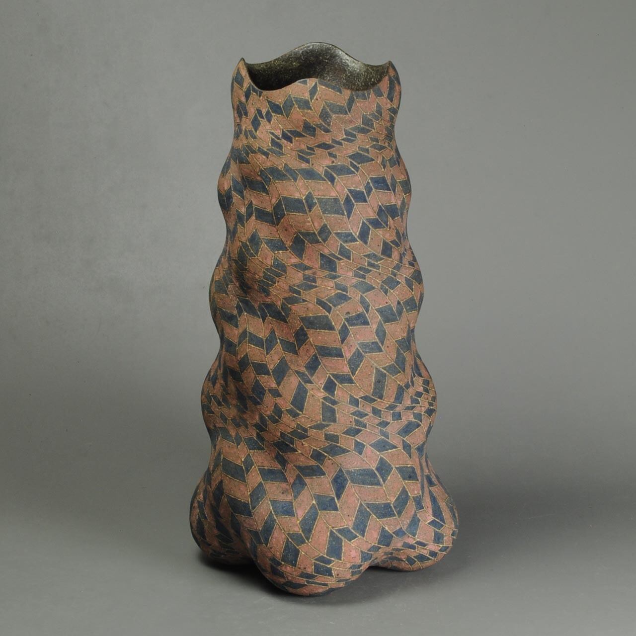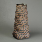 象嵌、彩色、焼きしめの壷です。細い白い線が象嵌で色の部分は顔料が彩色してあります。