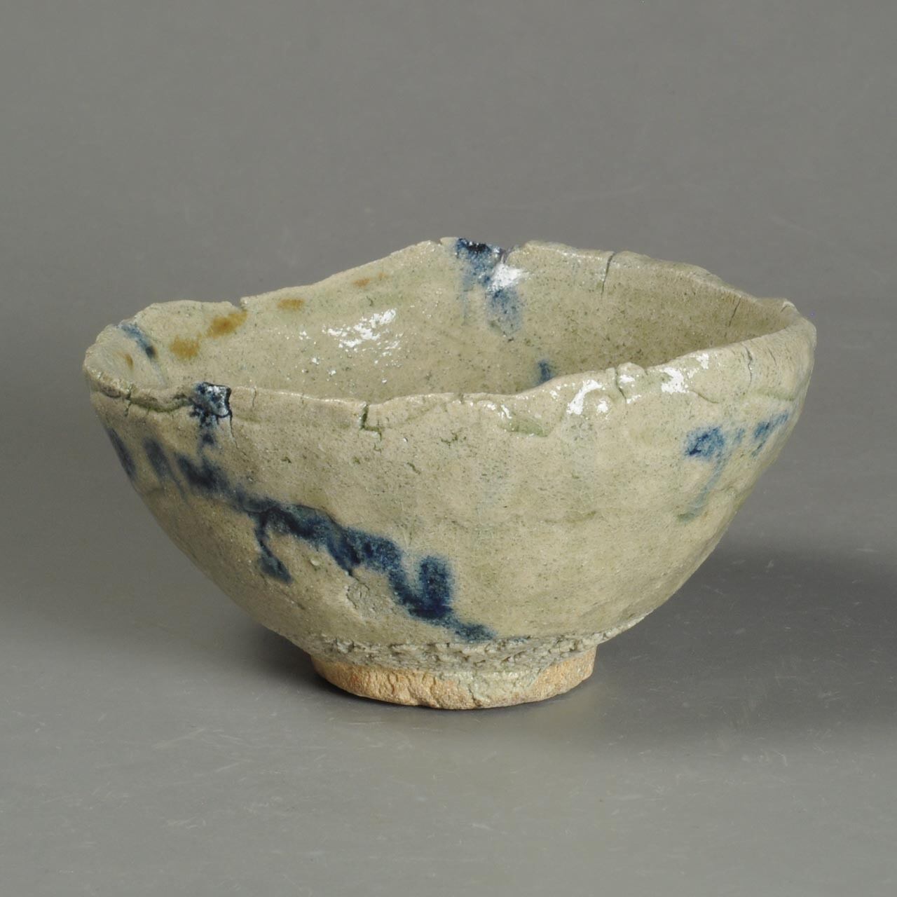 美濃系の白土の原土でタタラ成形で、釉薬は灰釉で呉須が振りかけてあります。