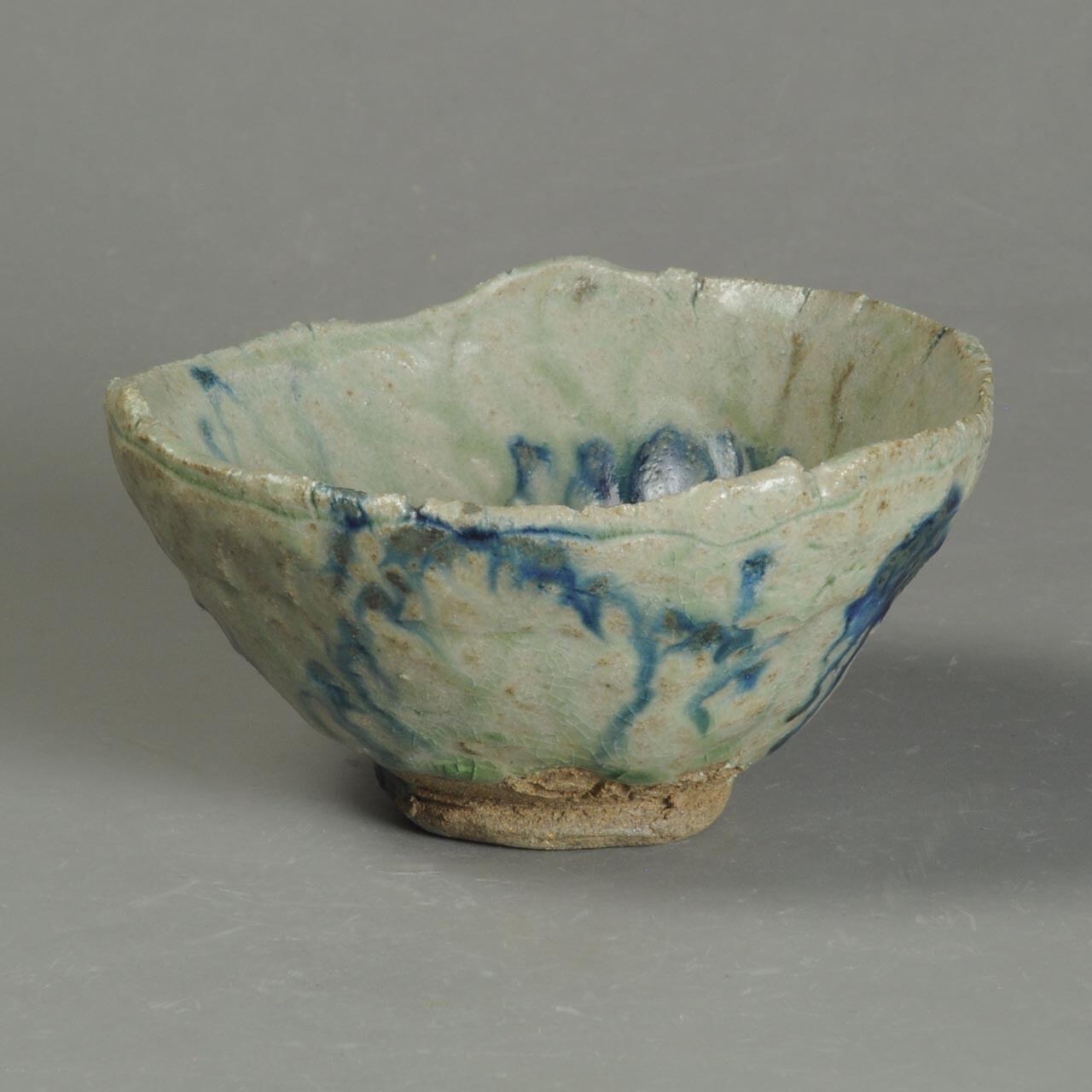 美濃系の少し鉄分のある原土でタタラ成形で、釉薬は灰釉で呉須が振りかけてあります。