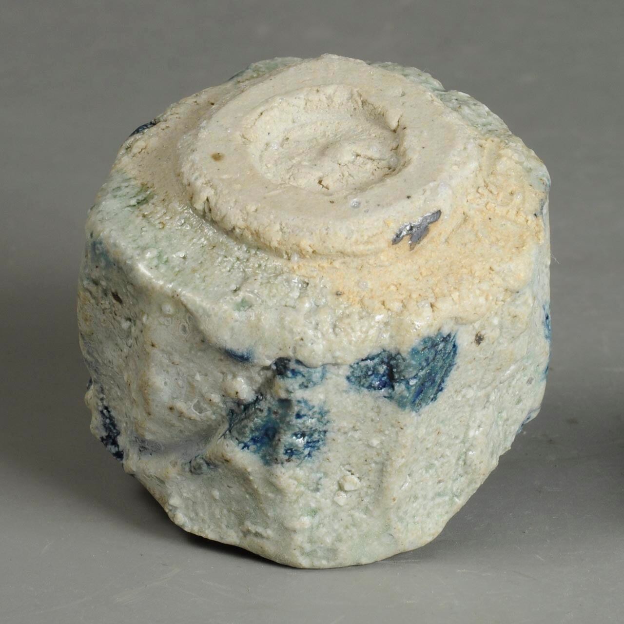 呉須で彩色し釉薬は灰釉で原土の荒々しさがでています。