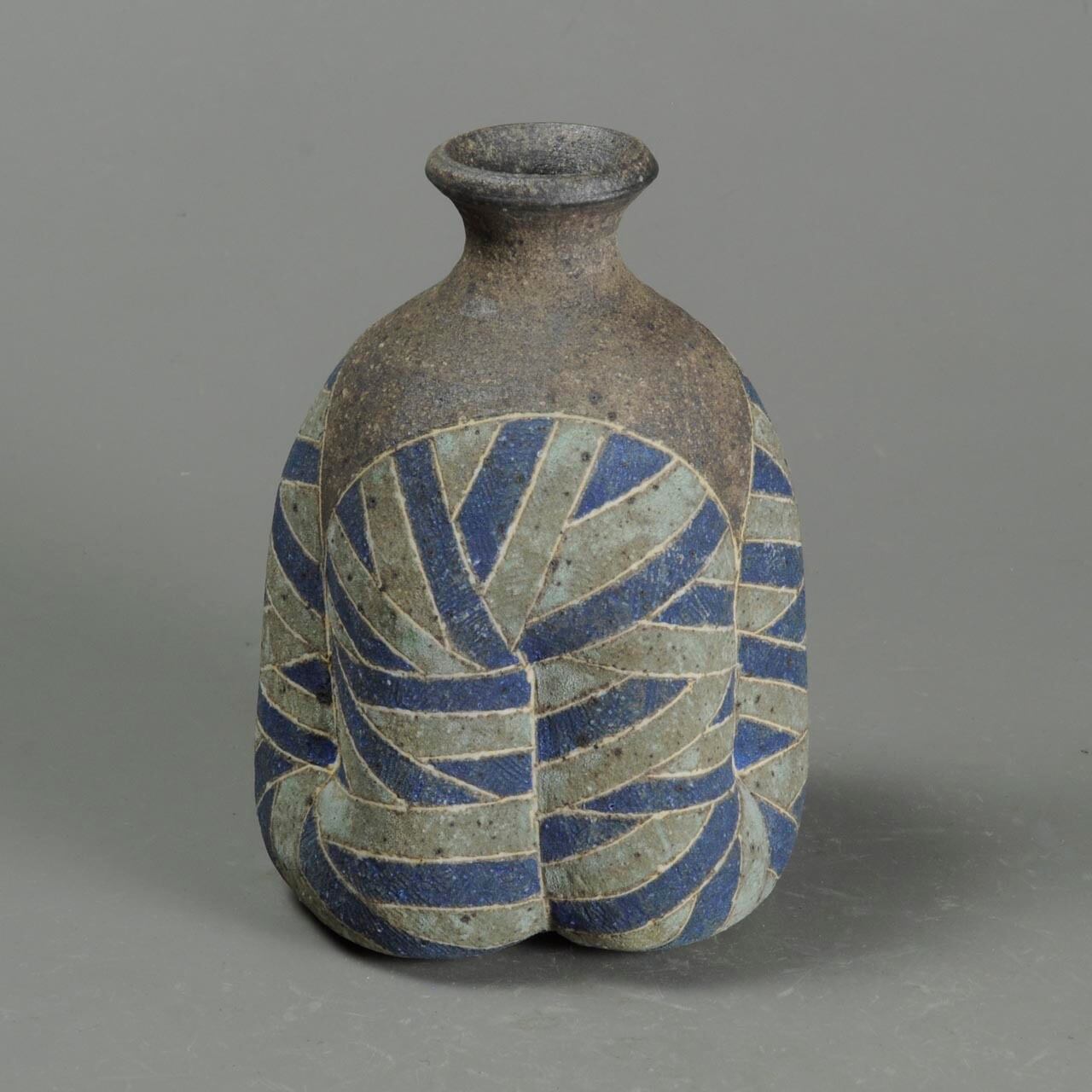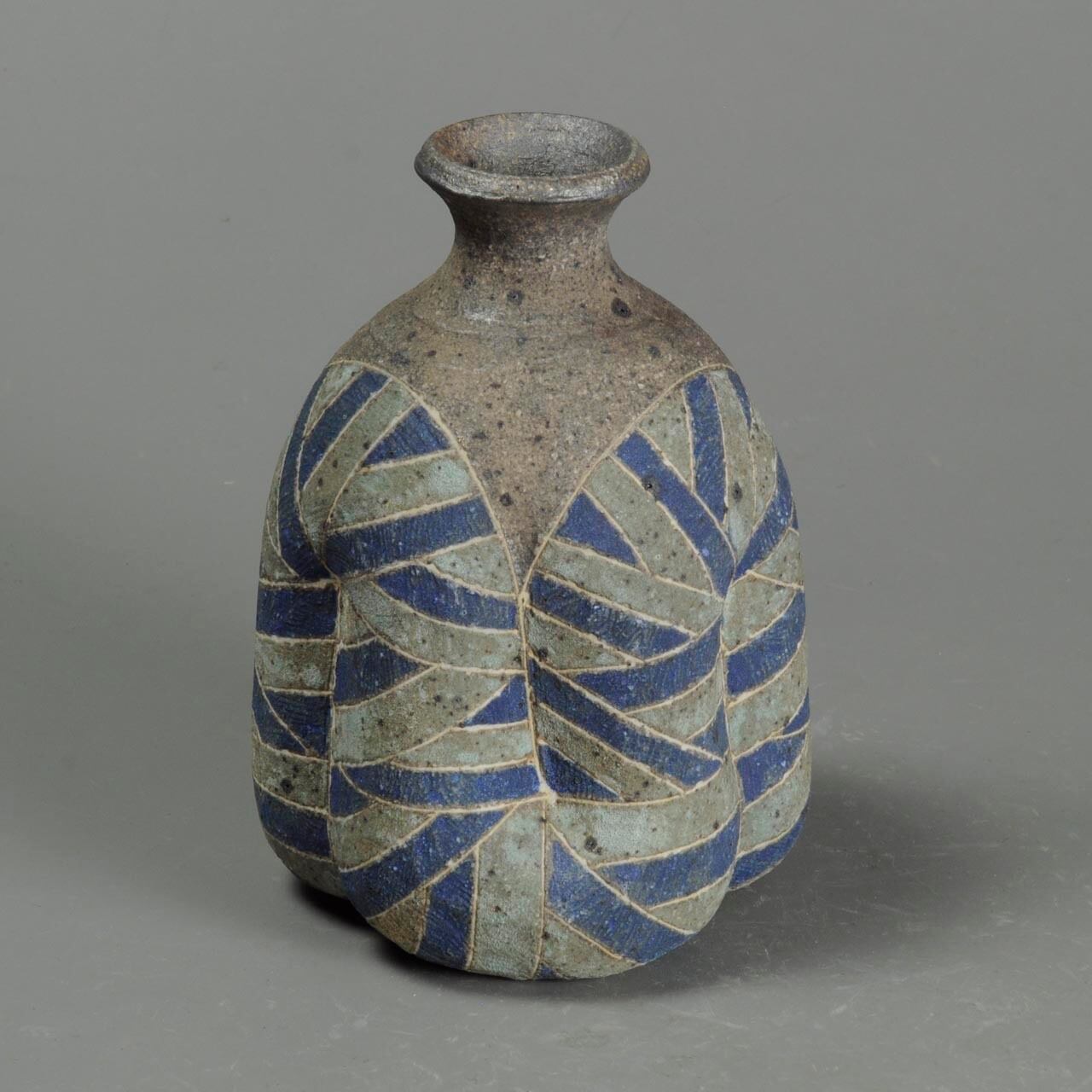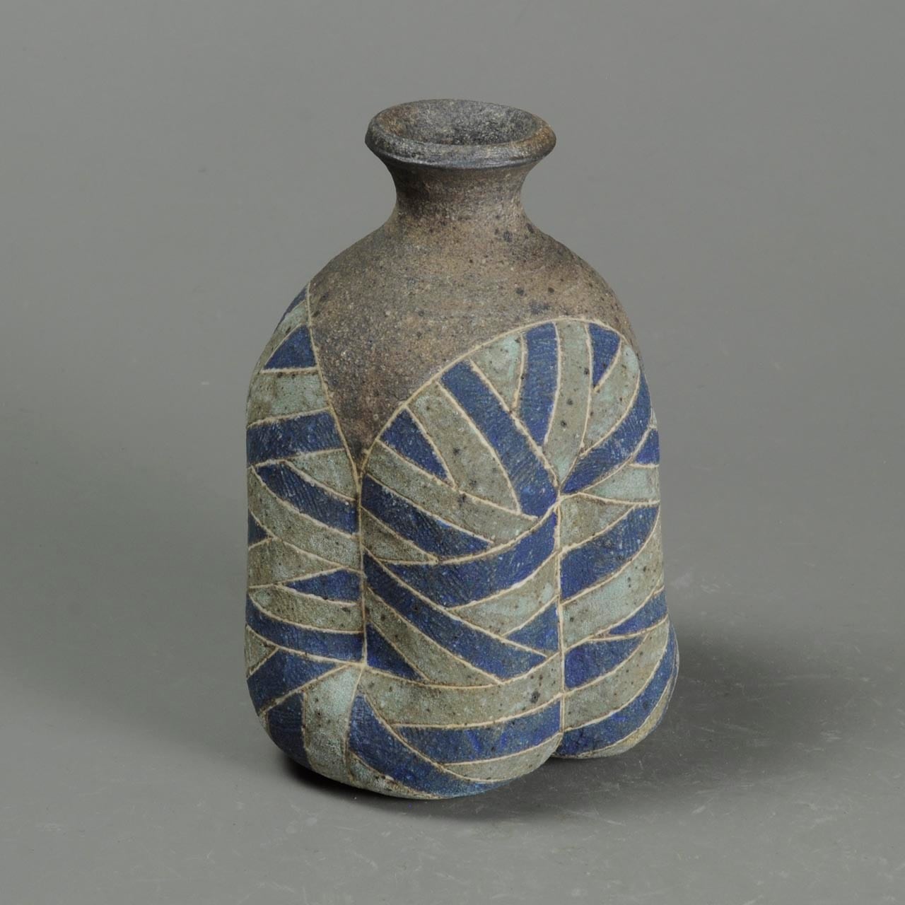 象嵌、彩色、焼きしめの徳利です。細い白い線が象嵌で色の部分は顔料が彩色してあります。