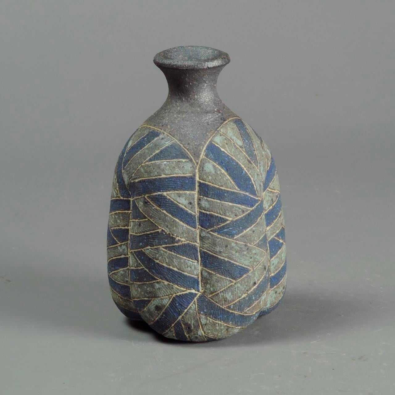 象嵌、彩色、焼きしめの徳利です。細い白い線が象嵌で色の部分は顔料が彩色してあります。