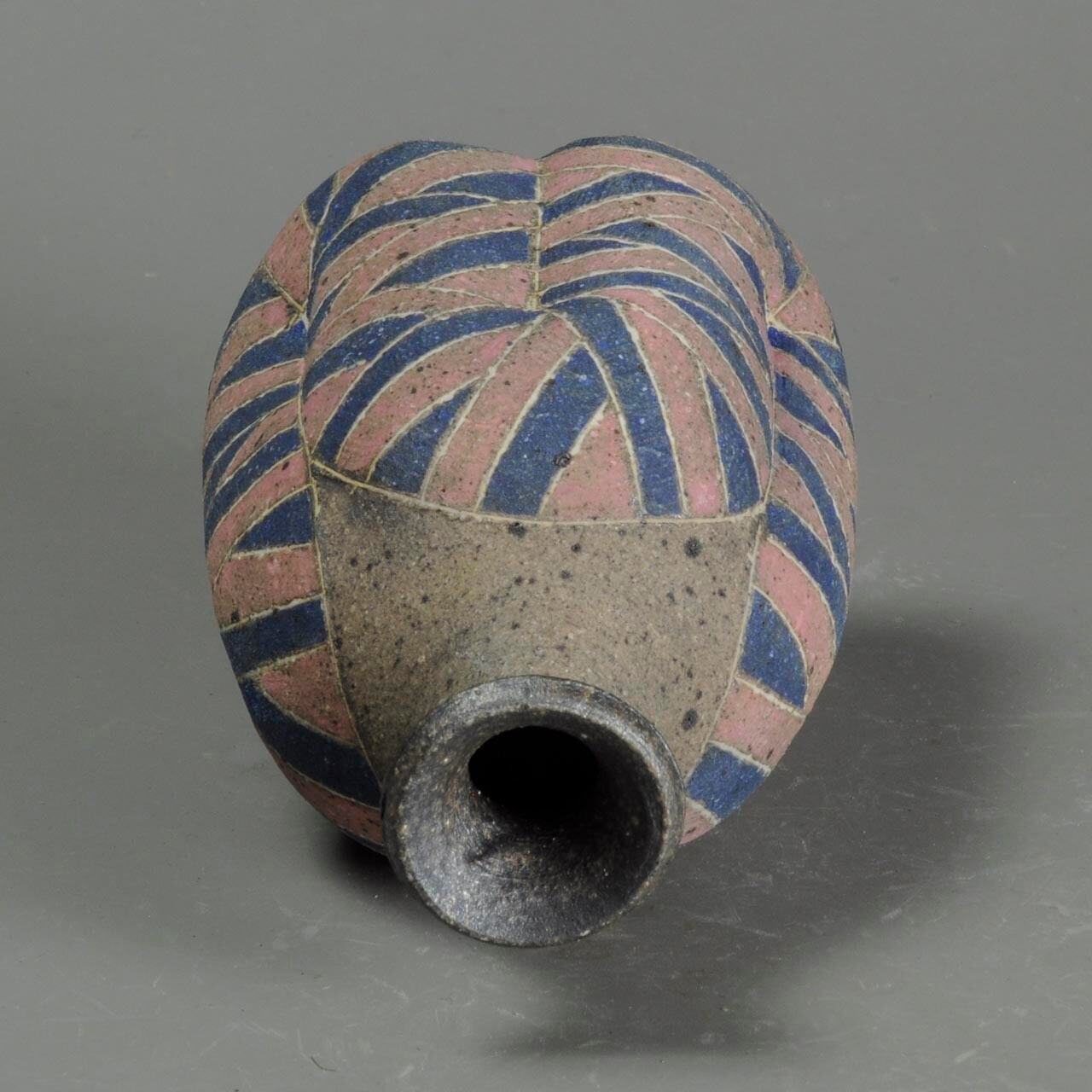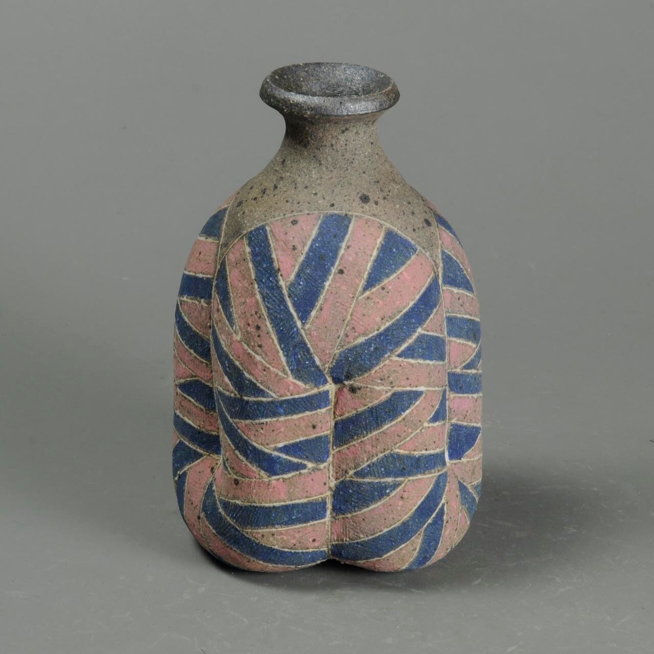 象嵌、彩色、焼きしめの徳利です。細い白い線が象嵌で色の部分は顔料が彩色してあります。