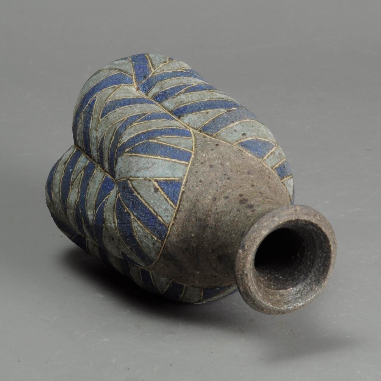 象嵌、彩色、焼きしめの徳利です。細い白い線が象嵌で色の部分は顔料が彩色してあります。