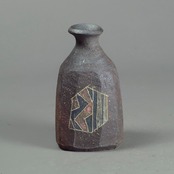 象嵌、彩色、焼きしめの徳利です。細い白い線が象嵌で色の部分は顔料が彩色してあります。