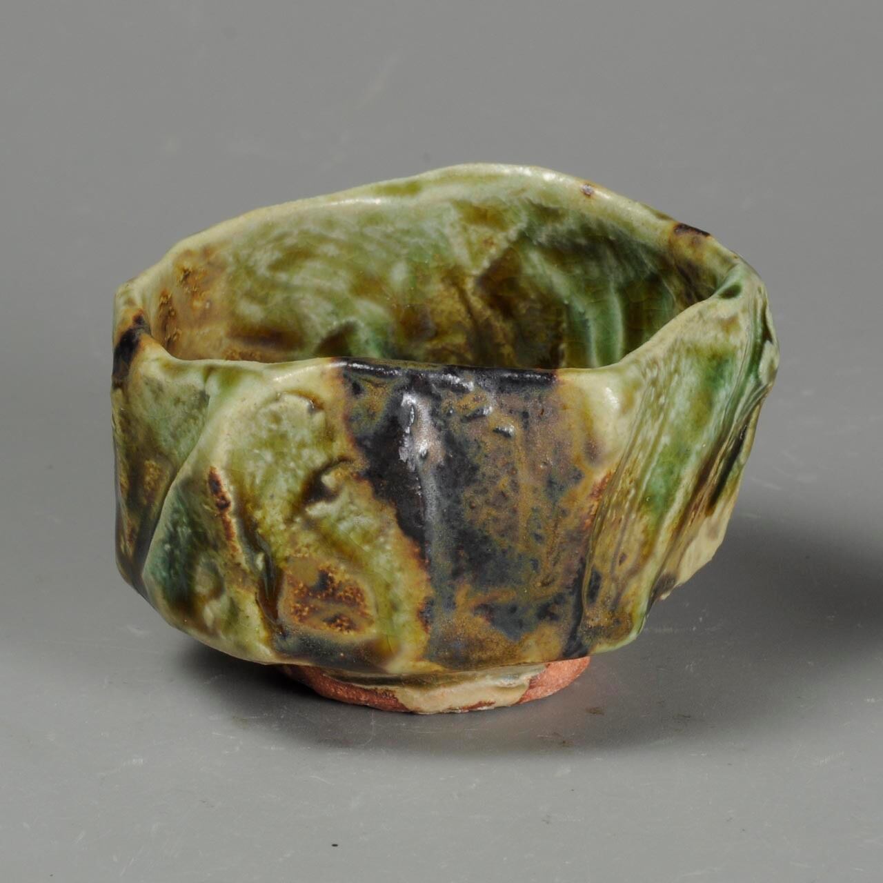 素地に初めに鉄彩をし灰釉と織部釉を掛け、酸化で焼成しています。