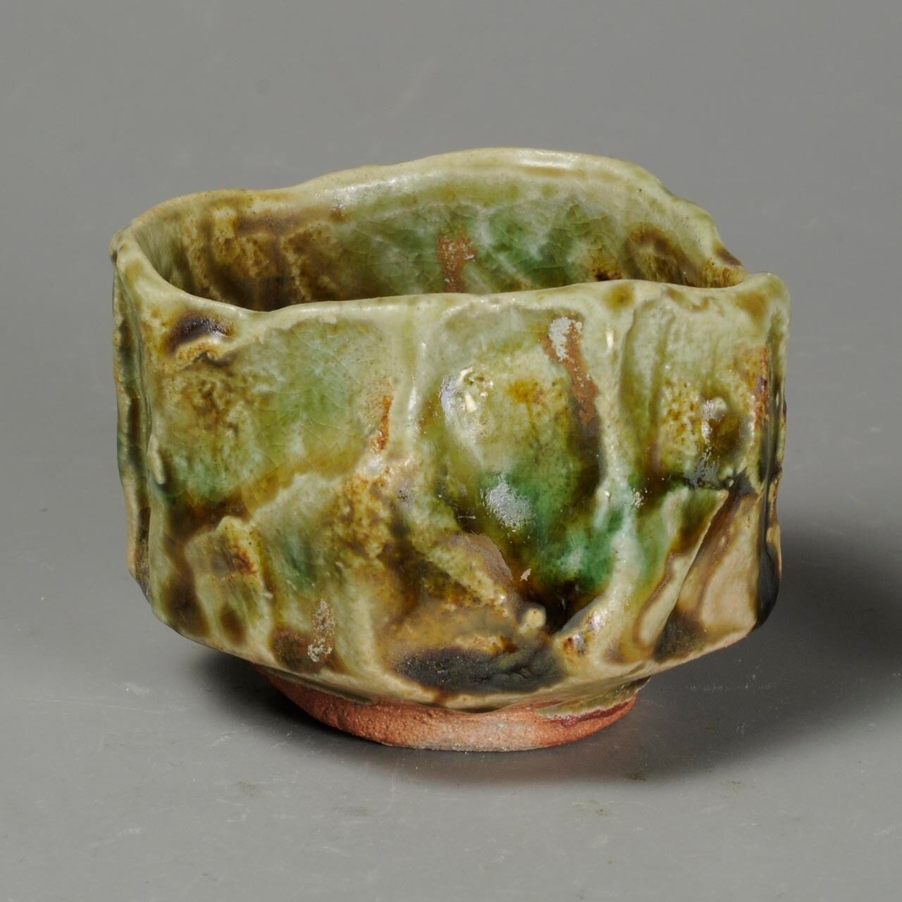 素地に初めに鉄彩をし灰釉と織部釉を掛け、酸化で焼成しています。