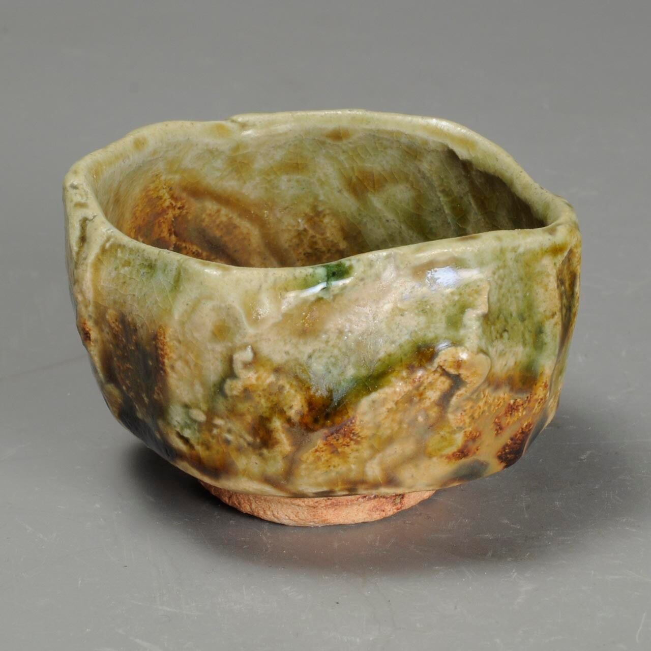 素地に初めに鉄彩をし灰釉と織部釉を掛け、酸化で焼成しています。