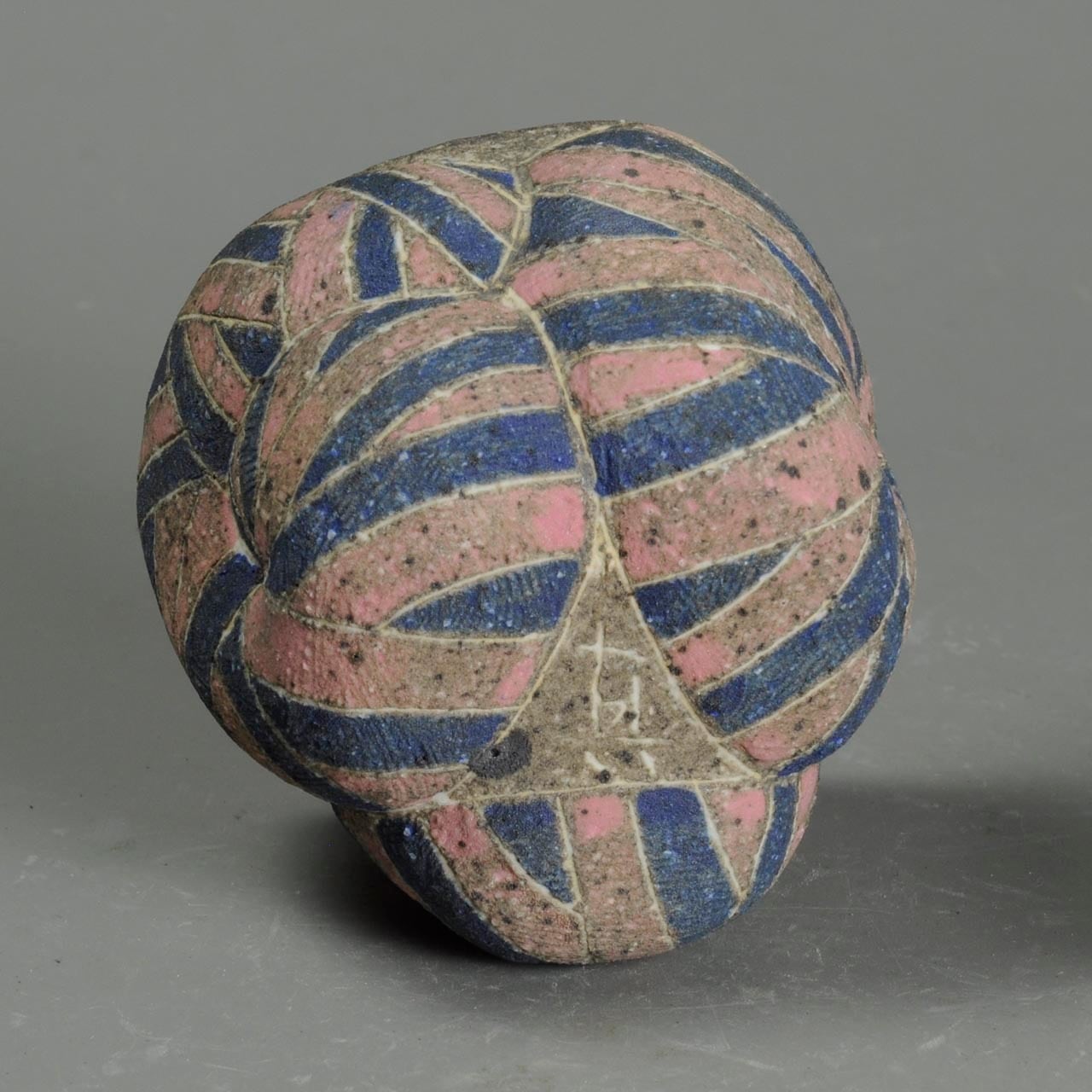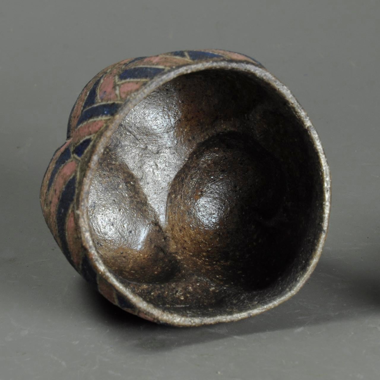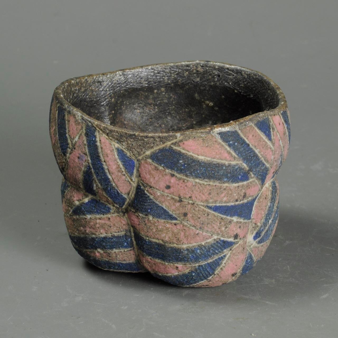 象嵌、彩色、焼きしめのぐい呑です。手びねり(玉作り)で成形しています。